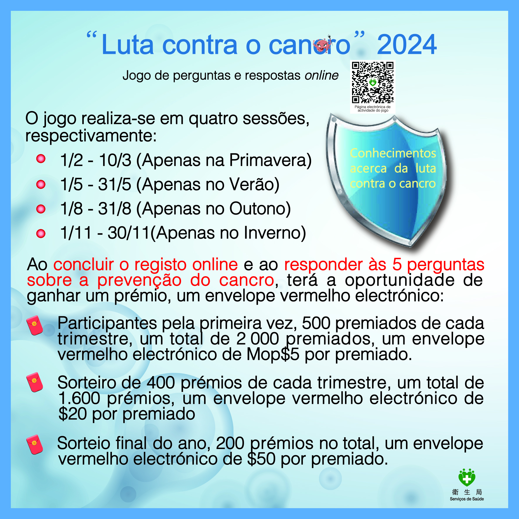 - Os Serviços de Saúde organizaram Jogos de perguntas e respostas online “Luta contra o cancro” que teve início no dia 1 de Fevereiro, em quatro estações, com o objectivo de divulgar a prevenção do cancro. Através do jogo de perguntas e respostas, os residentes podem aprofundar os seus conhecimentos nucleares sobre a prevenção e tratamento do cancro, através da seguinte página electrónica: https:// app.ssm.gov.mo/fightamainstacer2024. A participação imediata nos jogos dá a oportunidade de sortear os envelopes vermelhos electrónicos.