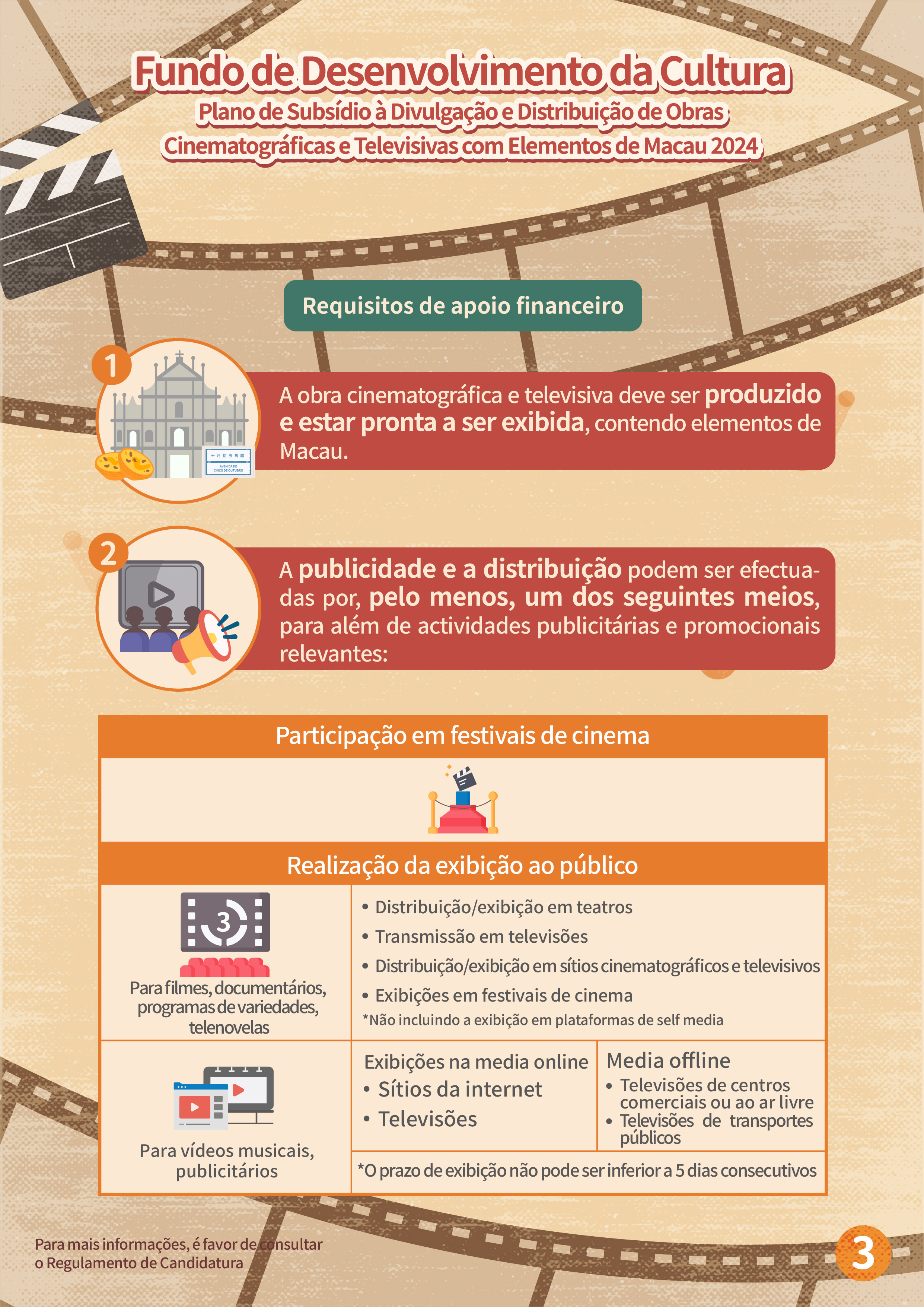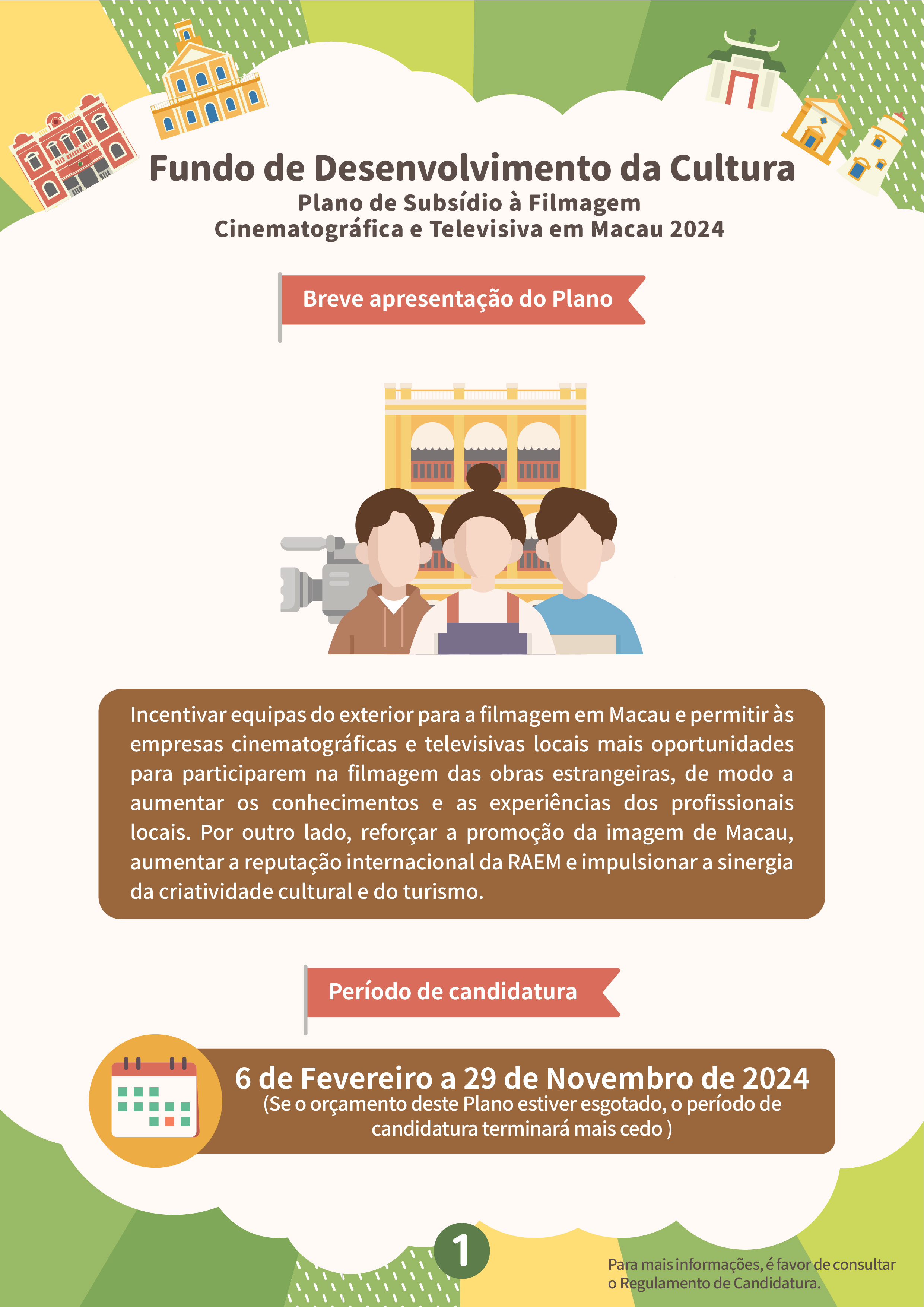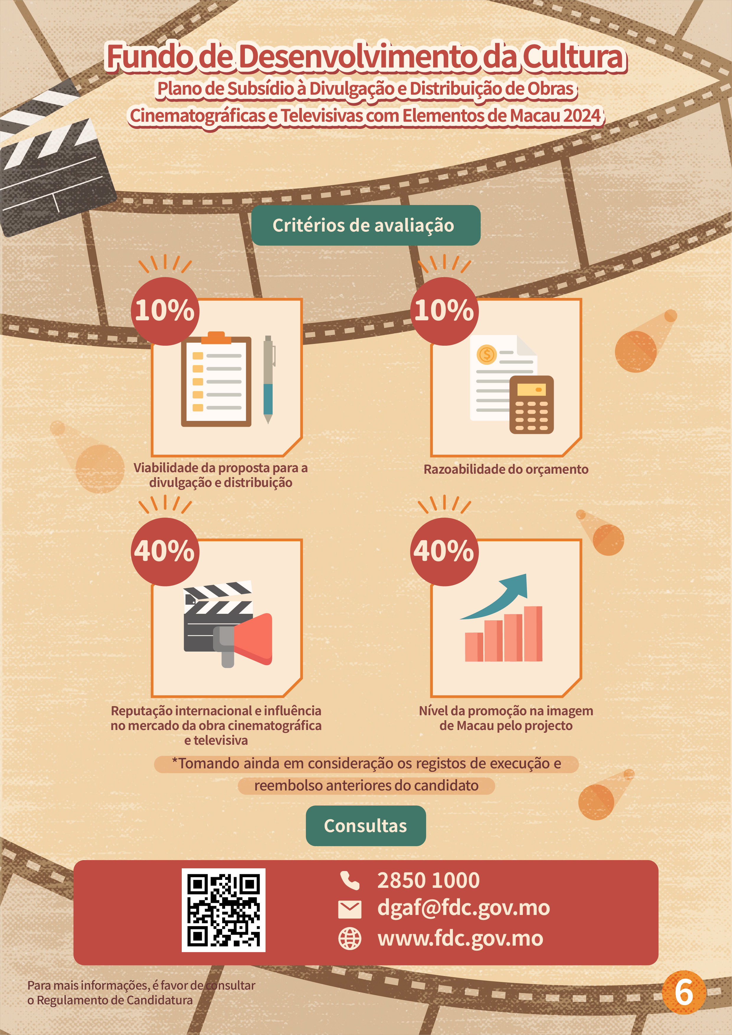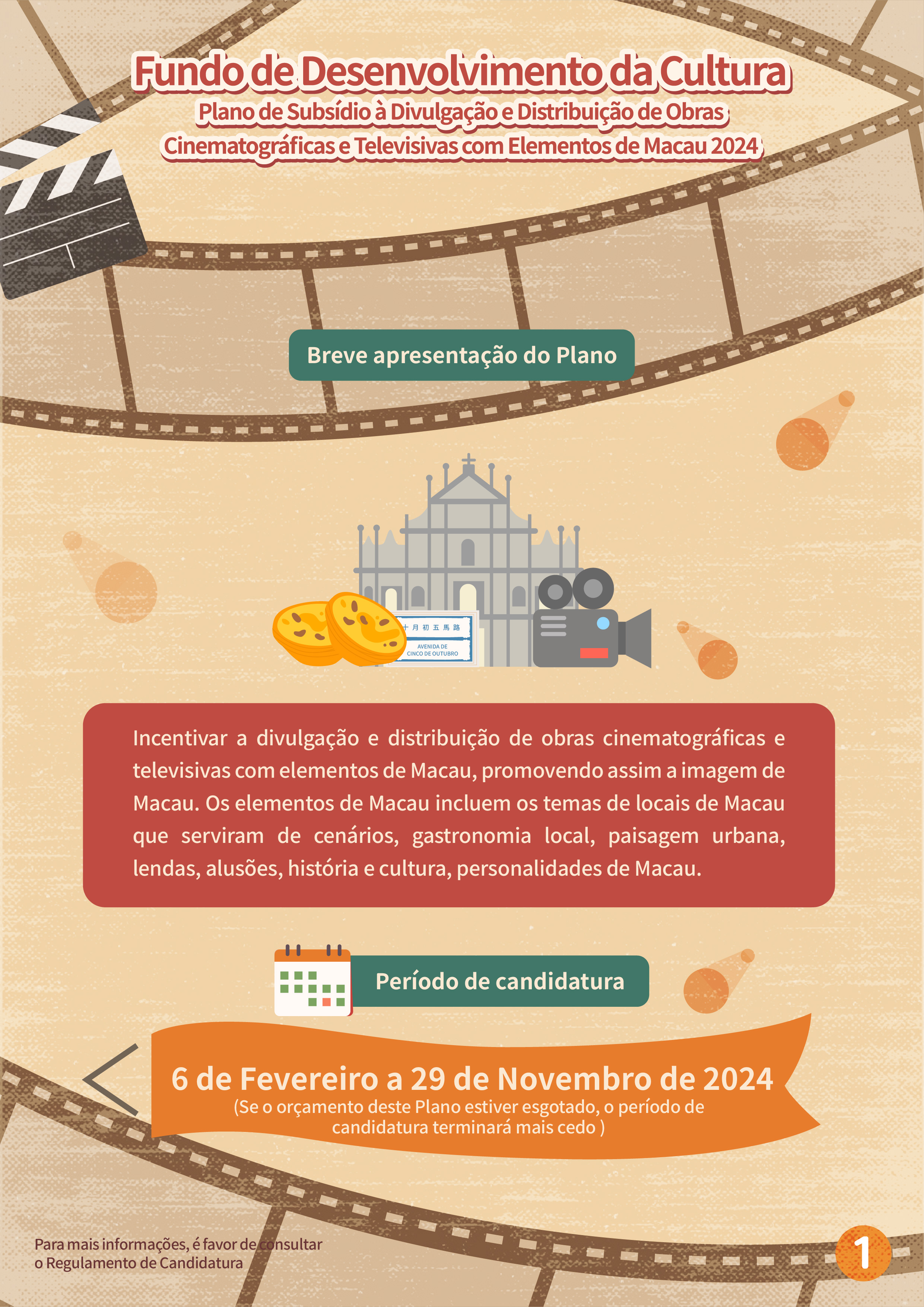 O “Plano de subsídio à filmagem cinematográfica e televisiva em Macau” tem por objectivo atrair equipas estrangeiras para a filmagem em Macau, e promover a imagem da cidade e melhorar a reputação internacional de Macau, através de produções cinematográficas e televisivas, proporcionando mais oportunidades para as empresas locais desta área a participarem nas filmagens de produções estrangeiras. Serão aceites projectos estrangeiros que ainda não tenham sido filmados em Macau antes do período de candidatura (6 de Fevereiro de 2024) e o tempo de filmagem em Macau não deverá ser inferior a três dias, sendo dirigidos por equipas de filmagem estrangeiras, as quais terão de vir a Macau para a respectiva filmagem. As candidaturas devem ser apresentadas pelos empresários comerciais locais que sejam unidades de produção em Macau, cujas actividades devem estar relacionadas com a produção cinematográfica e televisiva. Dentro do prazo de apoio financeiro, a exibição pública do projecto financiado deve estar concluída, tendo em conta que a duração do mesmo e dos locais de Macau que serviram de cenários do filme não podem ser inferiores ao limite de tempo especificado. O valor máximo a conceder é de 40% das despesas orçamentais para a realização da filmagem em Macau, até 2 milhões de patacas.