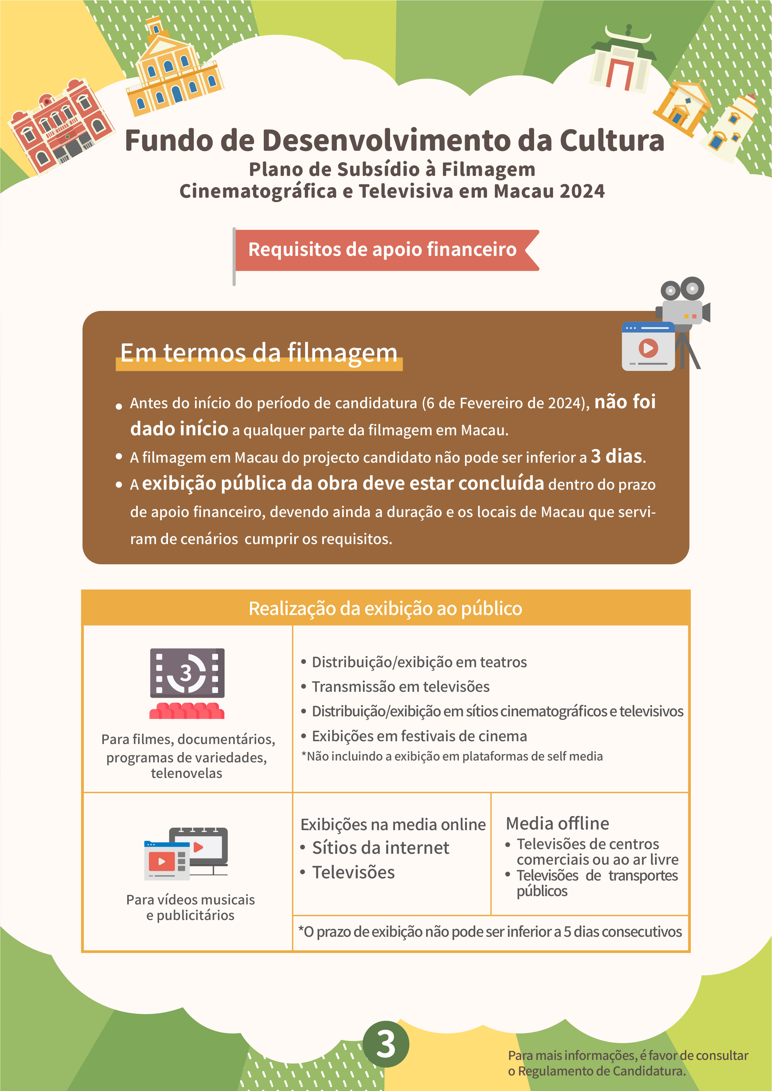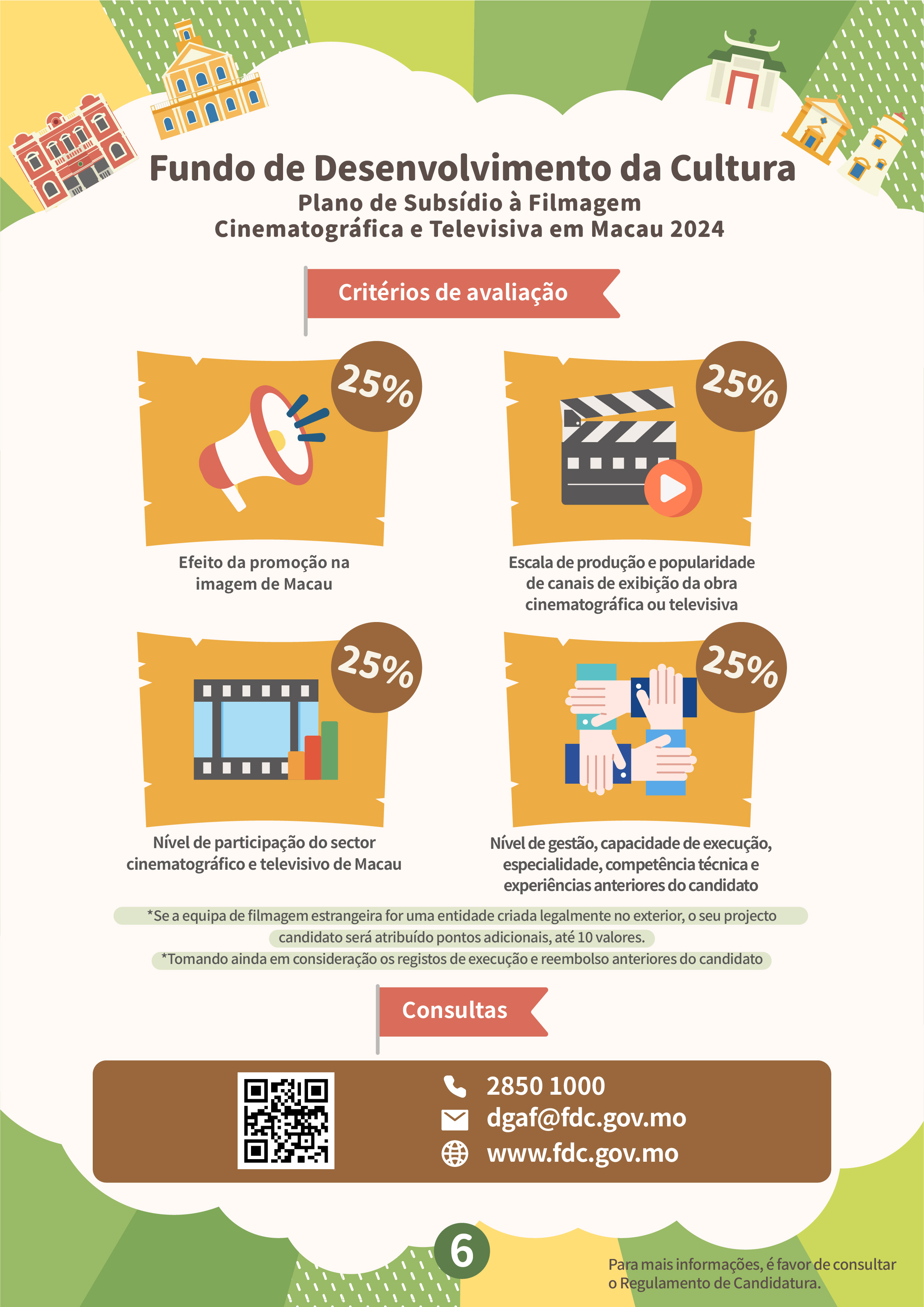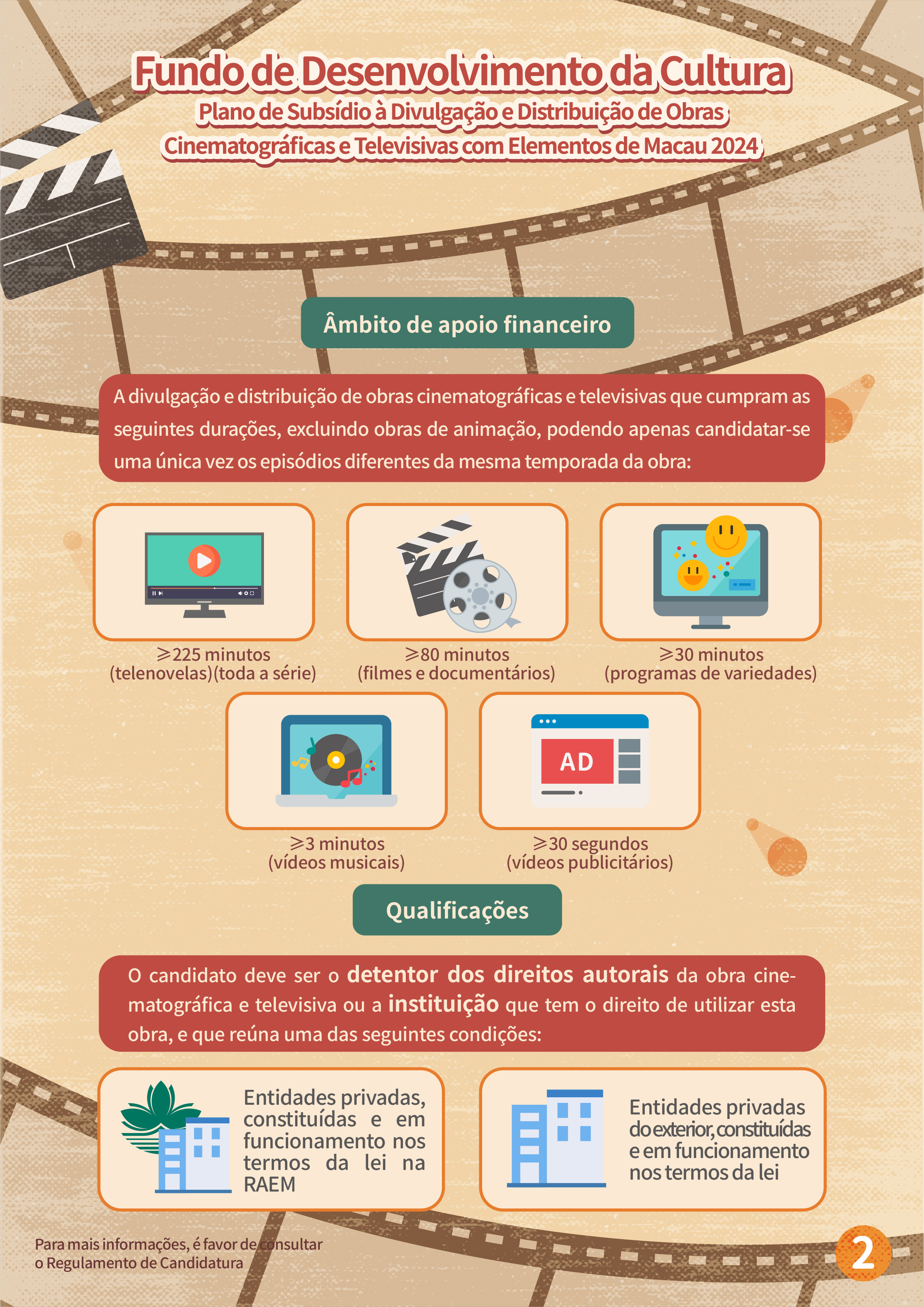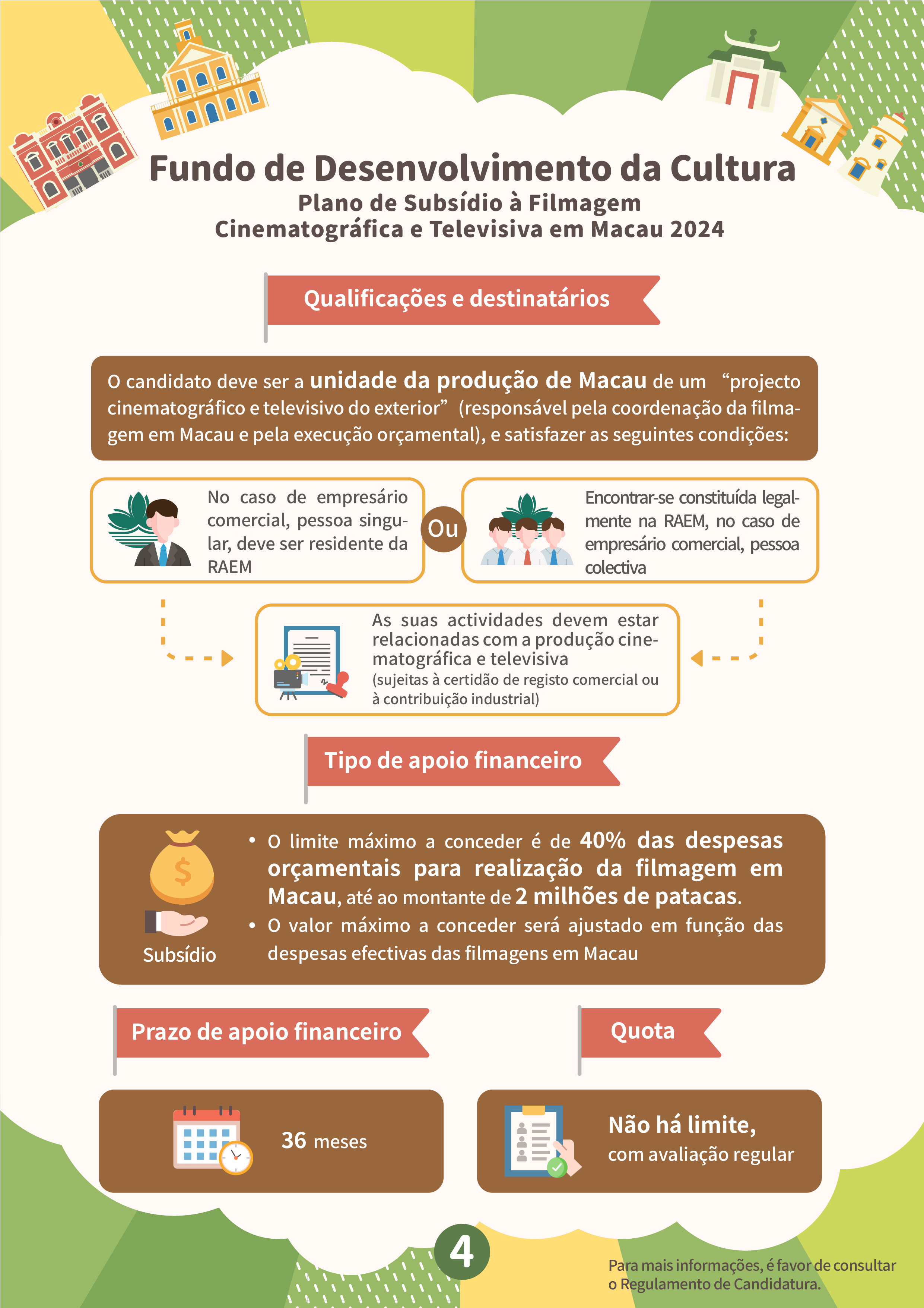O “Plano de subsídio à filmagem cinematográfica e televisiva em Macau” tem por objectivo atrair equipas estrangeiras para a filmagem em Macau, e promover a imagem da cidade e melhorar a reputação internacional de Macau, através de produções cinematográficas e televisivas, proporcionando mais oportunidades para as empresas locais desta área a participarem nas filmagens de produções estrangeiras. Serão aceites projectos estrangeiros que ainda não tenham sido filmados em Macau antes do período de candidatura (6 de Fevereiro de 2024) e o tempo de filmagem em Macau não deverá ser inferior a três dias, sendo dirigidos por equipas de filmagem estrangeiras, as quais terão de vir a Macau para a respectiva filmagem. As candidaturas devem ser apresentadas pelos empresários comerciais locais que sejam unidades de produção em Macau, cujas actividades devem estar relacionadas com a produção cinematográfica e televisiva. Dentro do prazo de apoio financeiro, a exibição pública do projecto financiado deve estar concluída, tendo em conta que a duração do mesmo e dos locais de Macau que serviram de cenários do filme não podem ser inferiores ao limite de tempo especificado. O valor máximo a conceder é de 40% das despesas orçamentais para a realização da filmagem em Macau, até 2 milhões de patacas.