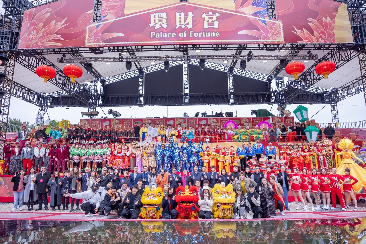 Quinze carros alegóricos repletos de votos de boa fortuna e 30 grupos de animação locais, do Interior da China, de Hong Kong e do exterior, num total de cerca de 1.000 artistas, partirão da Praça do Lago Sai Van, passando pela Avenida Dr. Sun Yat-Sen e terminando na Doca dos Pescadores de Macau. Os grupos de animação incluem: o Grupo Étnico de Danças e Cantares do Distrito de Qiandongnan da Província de Guizhou, a claque de Hong Kong LaLa TEAM, o grupo Street Ballet 20’ de França, Natural Cumbia da Alemanha, Krida Group da Indonésia, Royal Eagle Roller Team de Itália, Seoul Institute of the Arts da Coreia do Sul, Marcha da Madragoa de Portugal, Blue Mirrors da Eslovênia, Center of Internacional Cultural Exchange Promotion da Tailândia e grupos locais de Macau, os quais irão apresentar espectáculos de danças do dragão e do leão, e danças folclóricas portuguesas parte do património cultural intangível de Macau, bem como danças populares, danças de rua, malabarismo e espectáculo de andas, entre outras exibições de diferentes estilos.