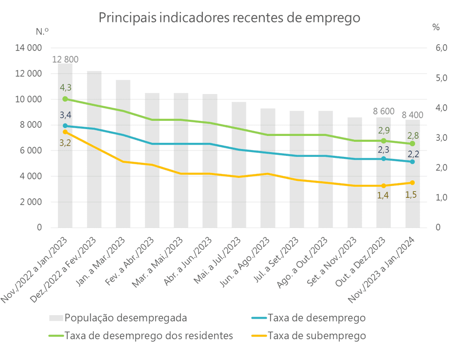 Entre Novembro de 2023 e Janeiro de 2024 a taxa de desemprego foi de 2,2% e a taxa de desemprego dos residentes correspondeu a 2,8%, tendo ambas descido 0,1 pontos percentuais, face ao período anterior (Outubro a Dezembro de 2023) e regressado aos níveis do início de 2020. A taxa de subemprego situou-se em 1,5%, tendo subido ligeiramente 0,1 pontos percentuais, informam os Serviços de Estatística e Censos.