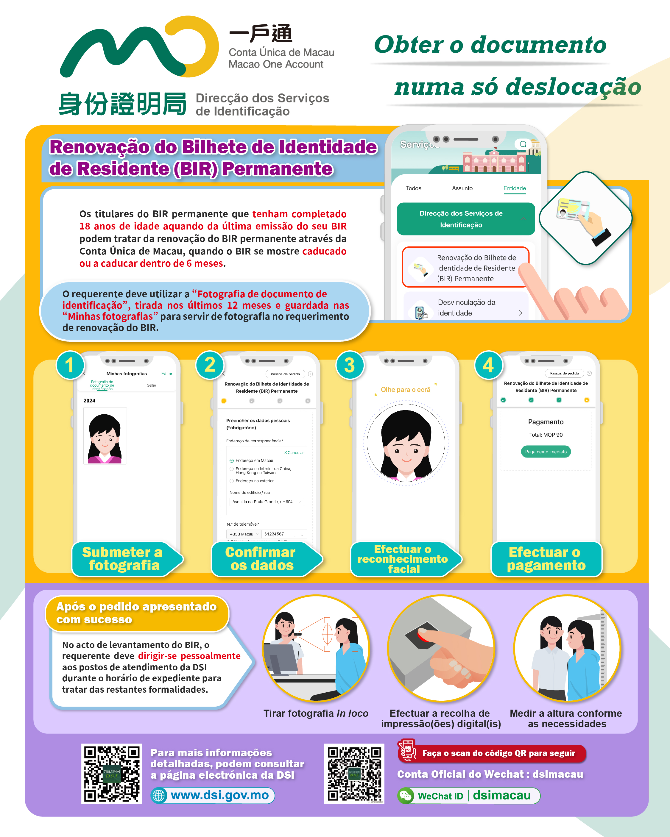 Depois de aceder à Conta Única de Macau, os residentes podem requerer a renovação do BIR através da funcionalidade “Renovação do Bilhete de Identidade de Residente (BIR) Permanente” e, no acto de pedido, devem utilizar a “Fotografia de documento de identificação”, tirada nos últimos 12 meses e guardada nas “Minhas fotografias” da Conta Única de Macau, para servir de fotografia no requerimento de renovação do BIR, e de seguida efectuar o reconhecimento facial para confirmação da identidade bem como o pagamento online para concluir as formalidades do pedido. Após concluída a produção do BIR, no acto de levantamento, o requerente deve deslocar-se pessoalmente à DSI, durante o horário de expediente, e tratar das restantes formalidades, nomeadamente tirar fotografia e efectuar a recolha de impressões digitais no local, e medir a altura no local (apenas se aplica aos requerentes com idade inferior a 25 anos aquando da última emissão do seu BIR).