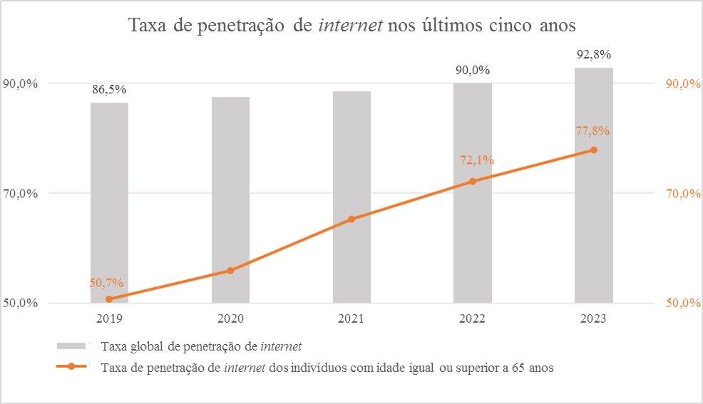 O número de utilizadores de internet em Macau foi de 597.300, mais 26.700 pessoas (+4,7%), em relação a 2022. A taxa de penetração de internet (92,8%) também cresceu 2,8 pontos percentuais. A taxa de penetração de internet de todos os grupos etários ascendeu relativamente a 2022, nomeadamente, a taxa do grupo dos 3 aos 14 anos (76,4%) aumentou 7,4 pontos percentuais. A taxa de penetração de internet dos indivíduos com idade igual ou superior a 65 anos (77,8%) também aumentou 5,7 pontos percentuais, face a 2022 e 27,1 pontos percentuais, face a 2019, tal reflecte que a tecnologia informática tem continuado a integrar-se na vida dos idosos.