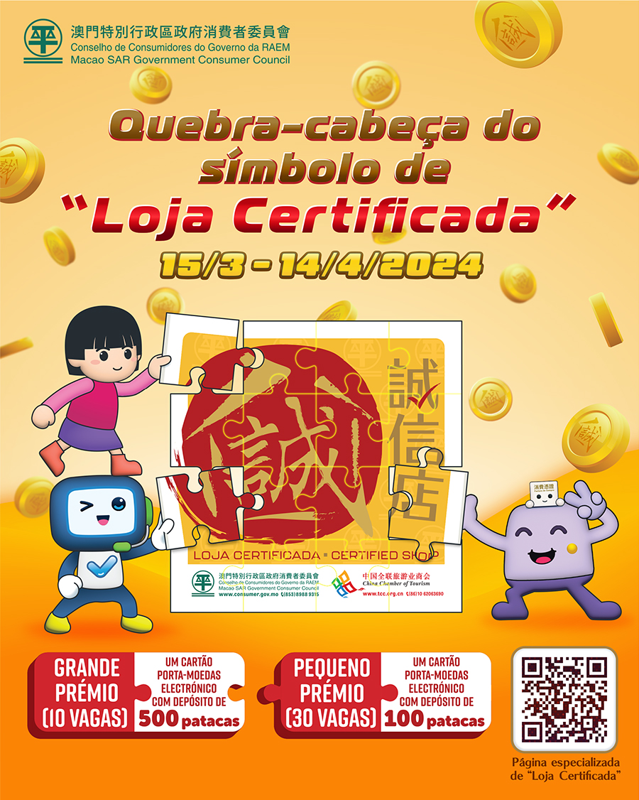 No sentido de aprofundar o conhecimento dos residentes sobre as Lojas Certificadas, o Conselho de Consumidores (CC) organiza a actividade “Quebra-cabeça do símbolo de Loja Certificada”, que decorrerá até 14 de Abril. A actividade dispõe de 10 grandes prémios e 30 pequenos prémios, que oferecem, respectivamente, um cartão porta-moedas electrónico (edição especial de Loja Certificada) com depósito de 500 patacas e um com depósito de 100 patacas. Os residentes são bem-vindos para participar proactivamente nesta actividade.