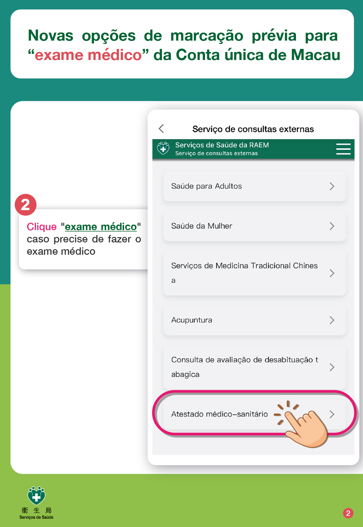 Para efectuar a marcação online do exame médico (através de qualquer uma das formas acima referidas), deve seguir os seguintes passos: clique sucessivamente "A minha saúde" > "Serviços de Consulta Externa" > "Marcação de Consultas Externas dos Centros de Saúde" > "exame médico", e, por último, escolha o tipo de exame médico pretendido. Depois concluída a marcação com sucesso, irá receber uma mensagem de texto via telemóvel. O serviço de exame médico deve ser marcado com 14 dias de antecedência. Pode consultar o registo de marcação de consulta externa dos Centros de Saúde em "Serviços de Consulta Externa" acima referido, bem como pode proceder à alteração da data de marcação ou cancelamento da marcação, entre outros serviços.