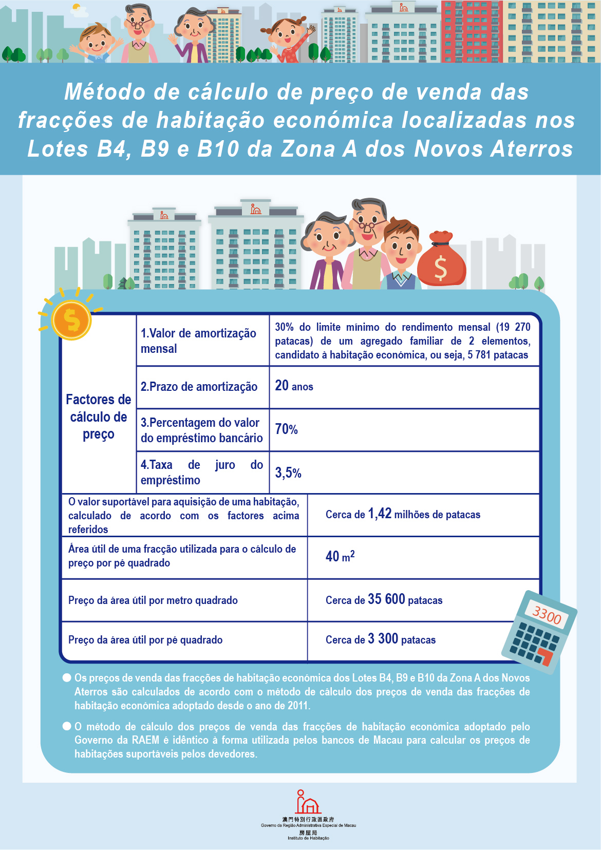 O cálculo concreto é efectuado de acordo com a amortização mensal estimada com base em 30% do actual limite mínimo do rendimento mensal (19 270 patacas) de um agregado familiar de 2 elementos candidato à habitação económica, um prazo de amortização de 20 anos, uma taxa de juros do empréstimo de 3,5% e uma percentagem do valor do empréstimo bancário de 70%, sendo, assim, calculado em 1 423 991 patacas o valor suportável para aquisição de uma habitação. Tendo o cálculo por base uma fracção com uma área útil de 40 metros quadrados, o preço da área útil por pé quadrado é de cerca de 3 300 patacas. De acordo com o valor base por pé quadrado, o preço concreto de venda, pode ser aumentado ou diminuído, dependendo da orientação, piso, localização, área e tipologia de cada fracção.
