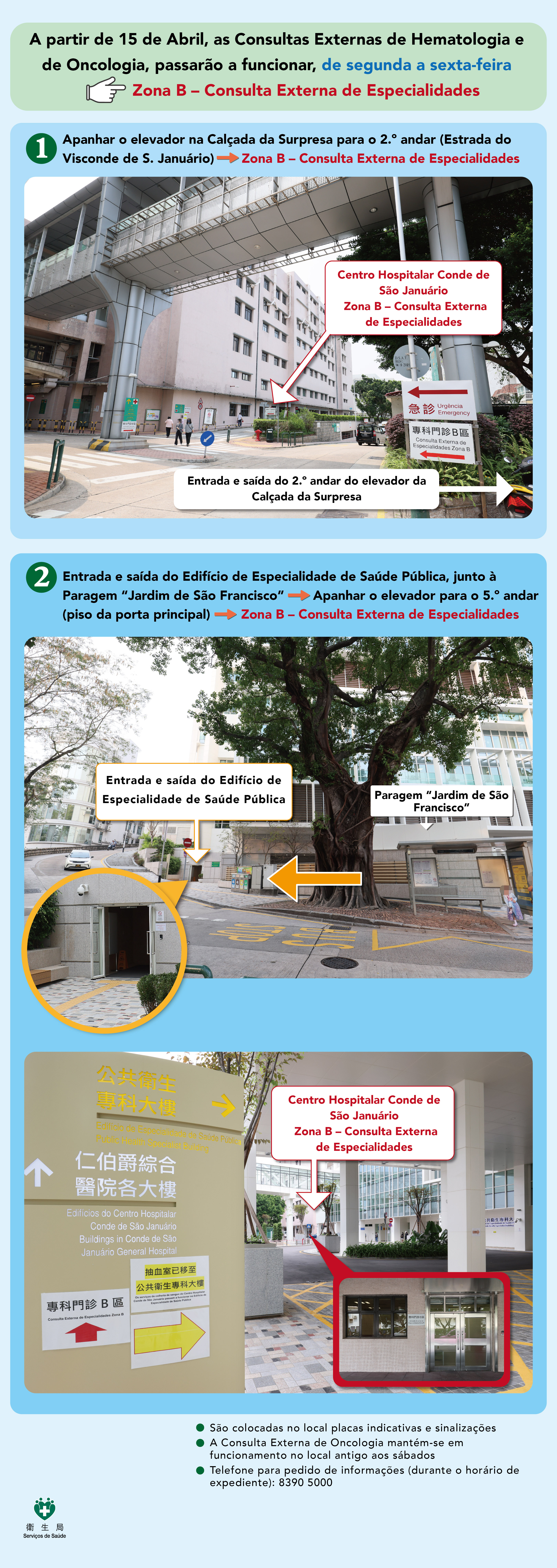 A partir de segunda-feira (dia 15), as Consultas Externas de Hematologia e de Oncologia do CHCSJ passaram a prestar serviços na Zona B das Consultas Externas de Especialidades, situada na cave 2 do Edifício da Clínica Obstétrica e Pediátrica, de segunda a sexta-feira, com vista a optimizar continuamente os serviços das Consultas Externas de Hematologia e de Oncologia, proporcionar aos utentes um ambiente de consulta mais confortável e independente, bem como a atender às necessidades crescentes de serviços de tratamento oncológico.