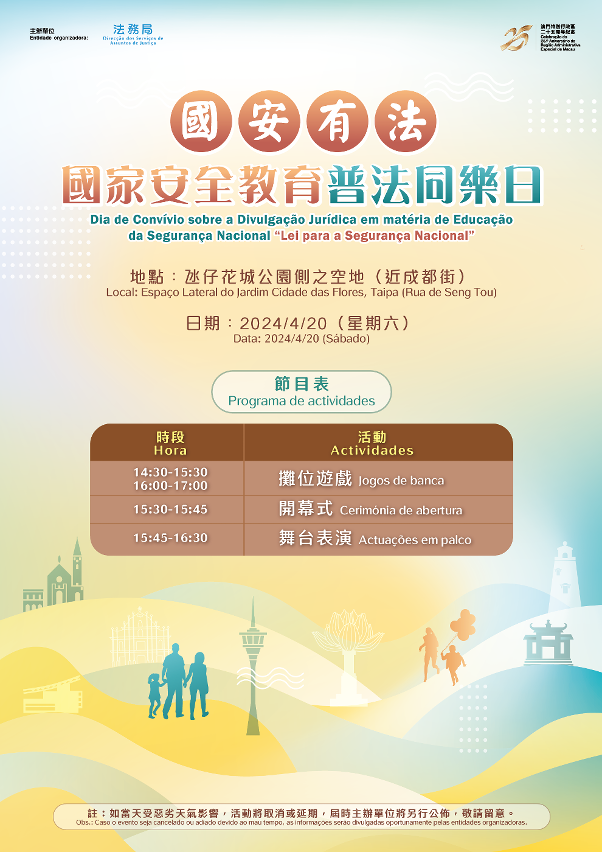 Com vista a celebrar o 75.º aniversário da fundação da República Popular da China e o 25.º aniversário do retorno de Macau à Pátria, a Direcção dos Serviços de Assuntos de Justiça irá realizar neste Sábado o Dia de Convívio sobre a Divulgação Jurídica em matéria de Educação da Segurança Nacional “Lei para a Segurança Nacional”, de modo a reforçar a sensibilização junto de todos os cidadãos sobre a segurança nacional e criar uma atmosfera em que toda a sociedade possa tomar a iniciativa para salvaguardar a segurança nacional, através da divulgação da Lei relativa à defesa da segurança do Estado.
