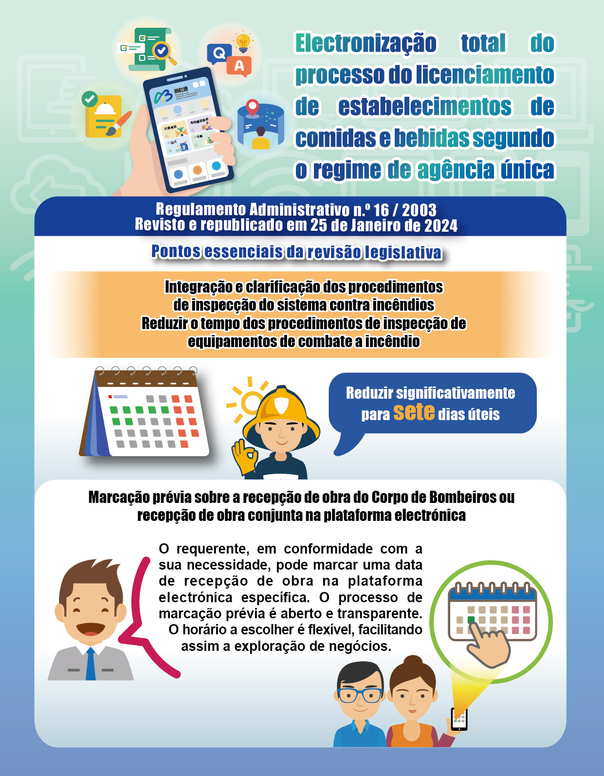 Com a introdução da licença prévia da obra, após a apresentação dos documentos necessários e o pagamento de taxas, o requerente recebe um recibo válido como a licença de obra, podendo iniciar de imediato as obras do estabelecimento no dia seguinte ao da emissão do recibo. A apreciação do caso poderá ser realizada simultaneamente com a execução das obras. Sob o novo regime, a vistoria e a inspecção contra incêndio serão abrangidas no procedimento do licenciamento. A marcação das datas para vistoria e inspecção é mais aberta e transparente. O respectivo resultado poderá ser consultado através da plataforma electrónica após a sua emissão. Citando o exemplo do primeiro caso de licenciamento concluído sob o novo regime, o titular do estabelecimento, ao apresentar pedido da licença para o seu estabelecimento, também pediu a licença prévia da obra, tendo esta sido emitida com sucesso no dia seguinte. A inspecção contra incêndio foi concluída em apenas 6 dias úteis, ficando assim resolvidos os problemas, que o sector levantou no passado, relacionados com a “dificuldade no início da obra, na apreciação e no início da actividade”.