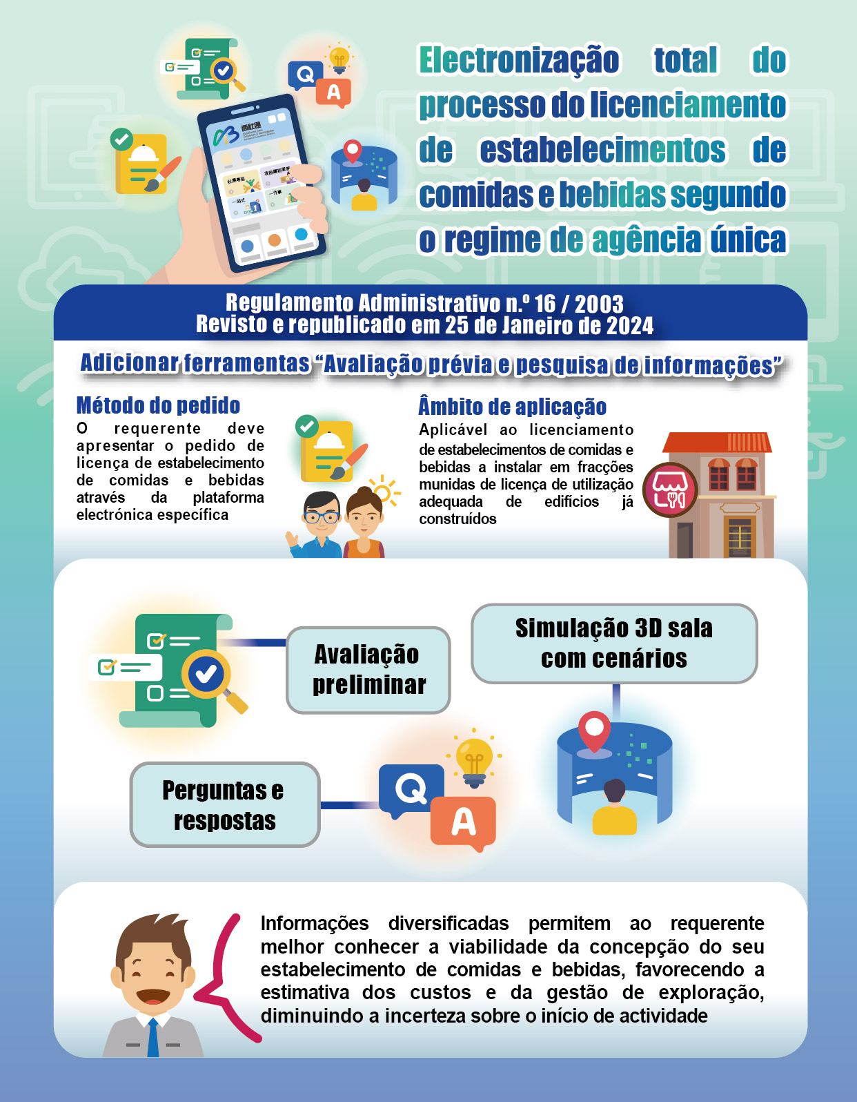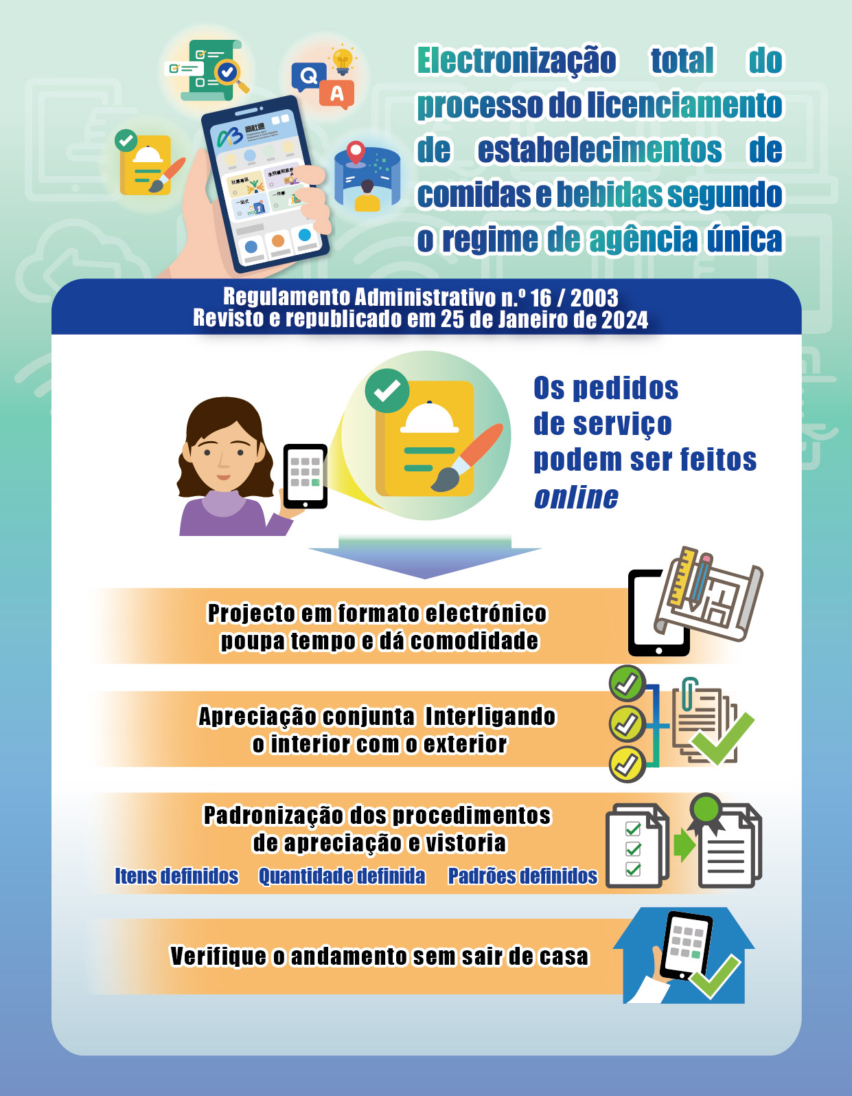 O “Procedimento de licenciamento de estabelecimentos de comidas e bebidas segundo o regime de agência única” foi alterado e republicado pelo Regulamento Administrativo n.º 2/2024. Desde a sua entrada em vigor em Janeiro do ano corrente, de acordo com as informações do Instituto para os Assuntos Municipais (IAM), cerca de 20 pedidos foram apresentados e tratados através da “Plataforma para Empresas e Associações”, representando quase 70% da quantidade total de pedidos. Nos termos das disposições transitórias do regulamento administrativo, a partir do dia 24 de Abril, o procedimento de licenciamento segundo o regime de agência única apenas é aplicável ao requerimento electrónico. Quem pretenda abrir estabelecimento de comidas e bebidas pode criar previamente uma conta individual ou de entidade, apresentando o pedido directamente via “Plataforma para Empresas e Associações”.