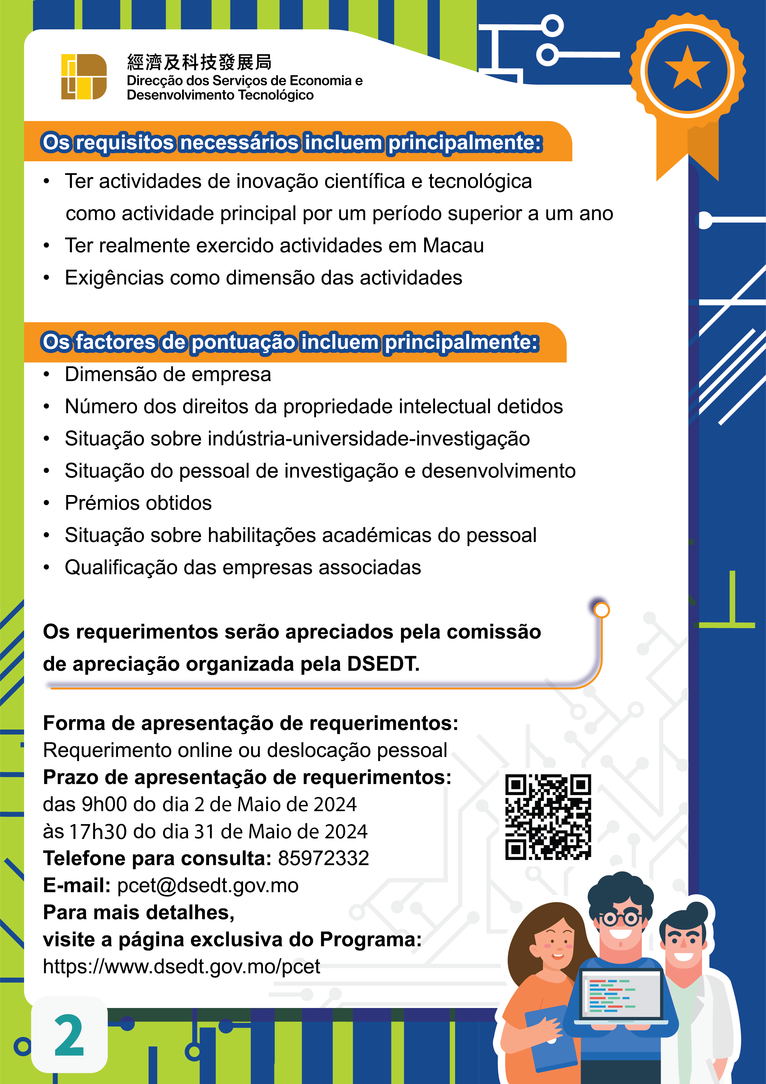 O prazo de requerimento da certificação do Programa decorre de 2 a 31 de Maio de 2024. As empresas interessadas podem apresentar o requerimento através do sistema online da DSEDT. Para mais informações, podem consultar a página exclusiva do Programa ( https://www.dsedt.gov.mo/pcet ) ou telefonar para o número 8597 2332.