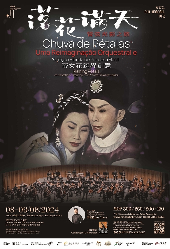 O andamento orquestral da “Chuva de Pétalas” foi escrito por Lee Che-yi, compositor e harpista de Taiwan, director musical da One Song Orchestra. Lee cooperou com vários artistas, de forma híbrida de culturas ocidental e oriental, para a representação da peça clássica da ópera cantonesa Princesa Floral. O realizador de ópera cantonense de Hong Kong, Rex Ng é o argumentista e editor audiovisual da obra, enquanto Joseph Chan e Ip Ka-po são directores de produção e Maurício Lai é o produtor executivo. A obra foi estreada em Hong Kong em 2022. Durante o decorrer do presente concerto, dirigido pelo maestro Lee Che-yi e com interpretação da Orquestra de Macau, será projectado simultaneamente o filme Princesa Floral reeditado, com Yam Kim-fai e Pak Suet-sin como protagonistas. Assim, os espectadores poderão apreciar o charme do filme Princesa Floral de uma forma sem precedentes e terão uma experiência extraordinária.