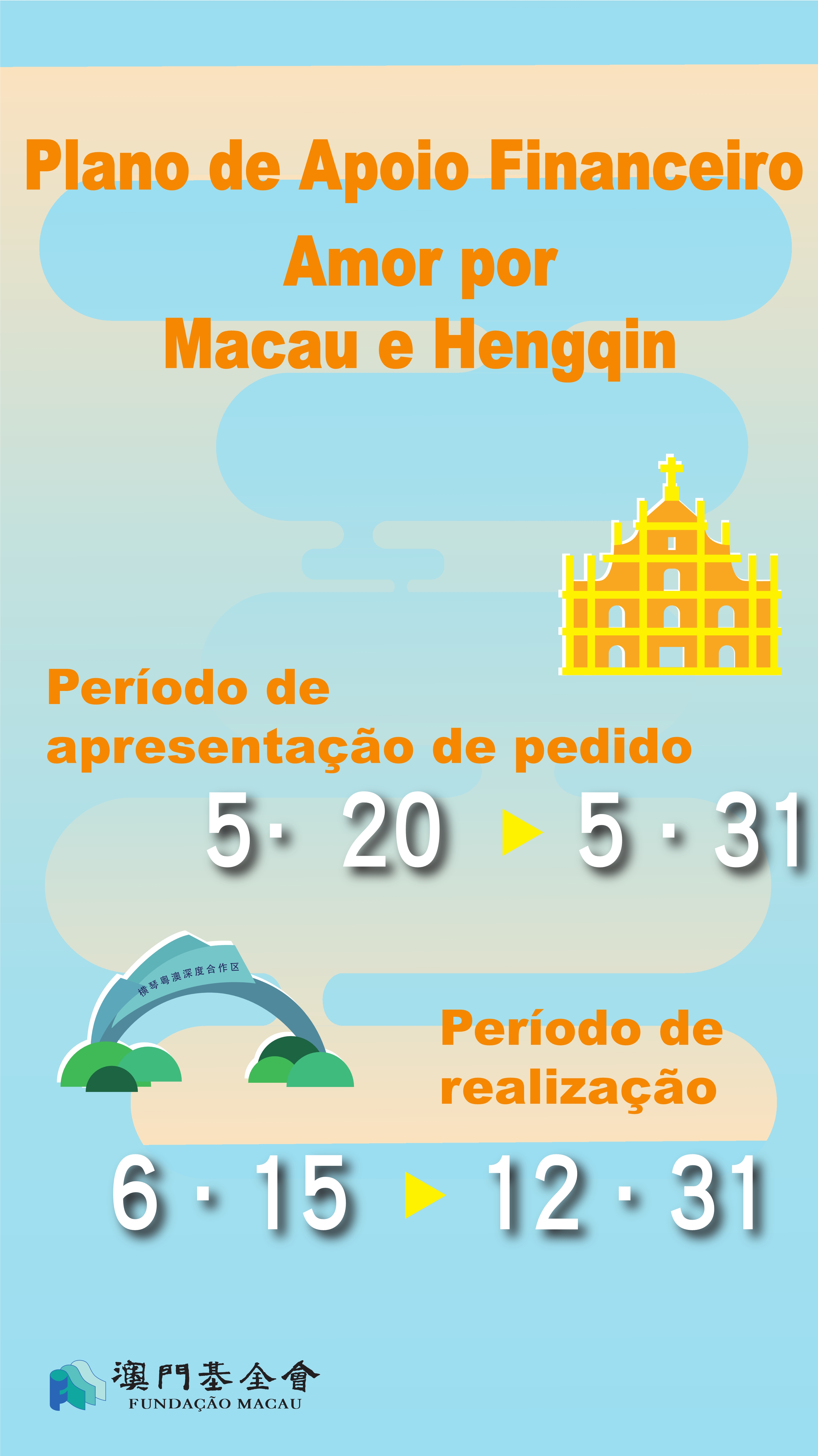 Com o objectivo de celebrar o 75º Aniversário da Implantação da República Popular da China, o 25º Aniversário do estabelecimento da Região Administrativa Especial de Macau e o 3º Aniversário do Estabelecimento da Zona de Cooperação Aprofundada entre Guangdong e Macau em Hengqin, de promover a integração de Macau e Hengqin, para estimular a economia comunitária de Macau, a Fundação Macau (doravante designado por FM) decidiu instituir o “Plano de Apoio Financeiro Amor por Macau e Hengqin” (doravante designado por Plano), para subsidiar associações que organizem visitas de um dia a Hengqin e oferecer vouchers electrónicos a serem consumidos em Macau.O período de candidatura a este plano vai de 20 a 31 de Maio de 2024.