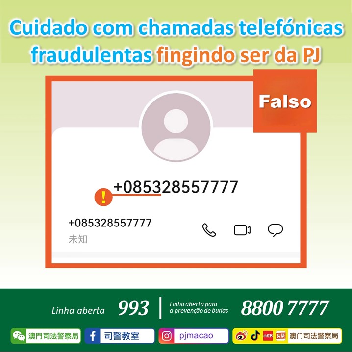 A PJ reitera que não faz chamadas para os cidadãos com o número de telefone “+085328557777”. Porém, os burlões podem alterar o número de identificação nas chamadas telefónica utilizando softwares de rede para o efeito. Assim, os cidadãos devem estar atentos a chamadas desconhecidas provenientes do exterior e não confiar facilmente na identidade alegada pela pessoa do outro lado da linha. A PJ nunca pede aos cidadãos que entrem em contacto com a polícia da China continental e também não realiza "investigações online". De igual modo, nunca pede dados pessoais ou dados bancários. Se deparar com alguma dessas situações, trata-se certamente de uma fraude.
