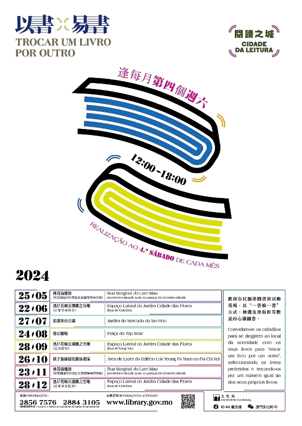 A fim de estimular a promoção de leitura nos bairros comunitários e promover o conceito de “incorporar a leitura na vida quotidiana”, o Instituto Cultural (IC) lançou pela primeira vez em Março deste ano a actividade “Trocar um Livro por Outro”, sendo bem acolhida pelo público. A fim de continuar a contribuir para a construção de uma cidade da leitura, a actividade “Trocar um Livro por Outro” será realizada mensalmente (no quarto Sábado de cada mês), de Maio a Dezembro, nas comunidades da Península de Macau ou da Taipa, aumentando a circulação de recursos de leitura na comunidade através da construção de uma plataforma estável de troca de livros.