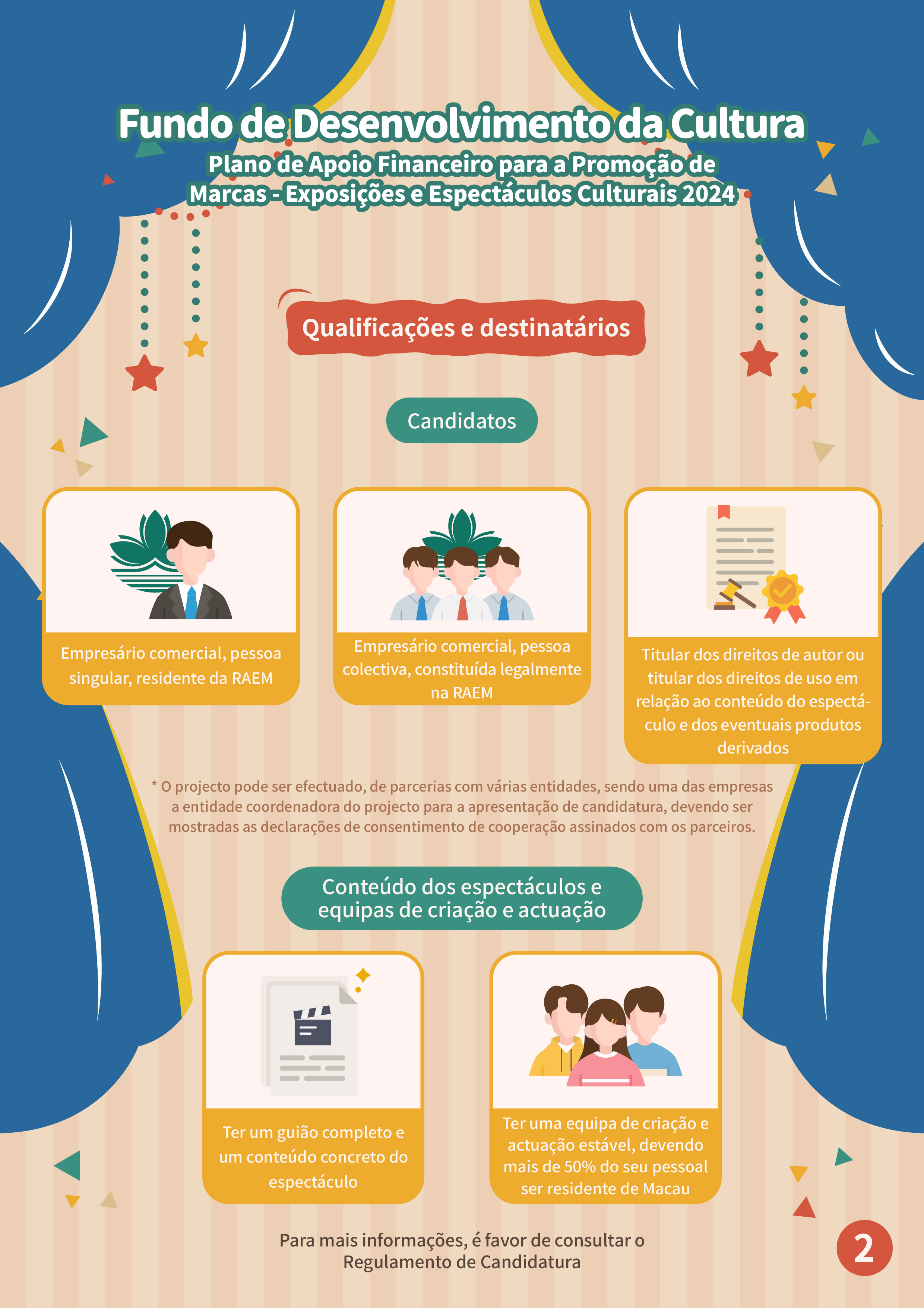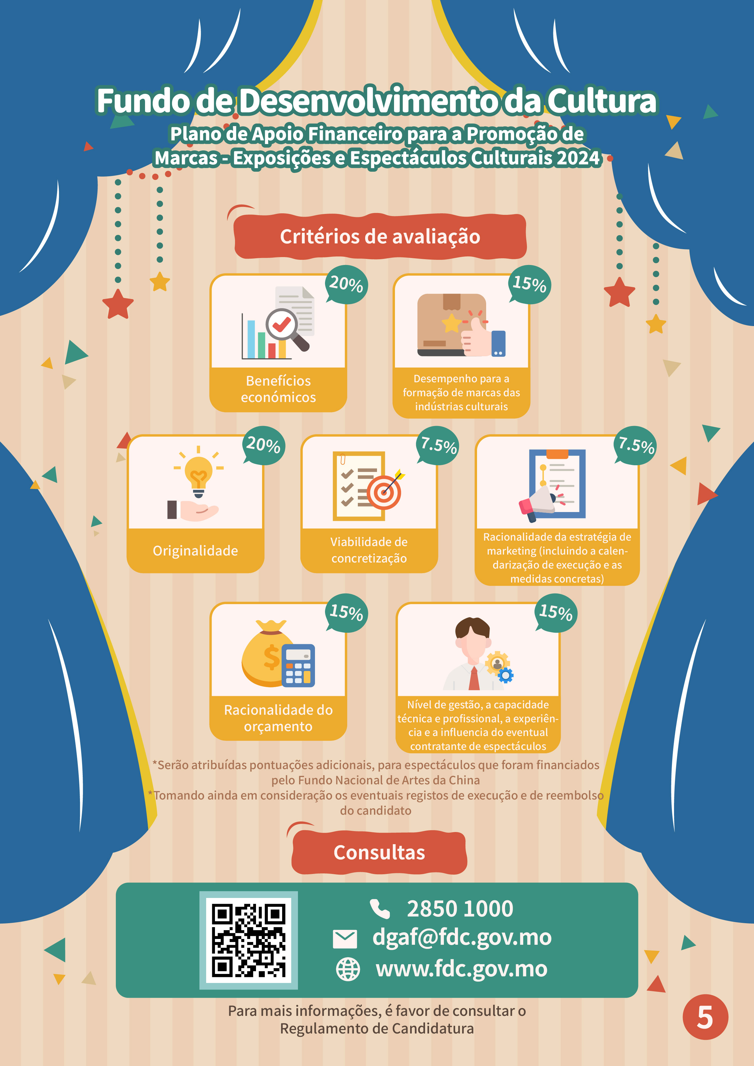 Com vista a apresentar em detalhe os assuntos sobre as candidaturas ao “Plano de Apoio Financeiro para a Promoção de Marcas - Exposições e Espectáculos Culturais 2024” e responder às dúvidas dos candidatos, será realizada uma sessão de esclarecimento no dia 2 de Julho, às 15h00, no Auditório situado no 7.º andar do Edifício Centro Comercial Cheng Feng (Endereço: Alameda Dr. Carlos d’Assumpção 322-362), podendo os interessados inscrever-se na página electrónica do FDC (www.fdc.gov.mo): "Sistema de marcação" no âmbito da "Área dos serviços electrónicos e de descarregamento". Para quaisquer consultas, é favor de contactar-nos através do telefone, n.º 8985 0834 ou por email, dgaf@fdc.gov.mo.