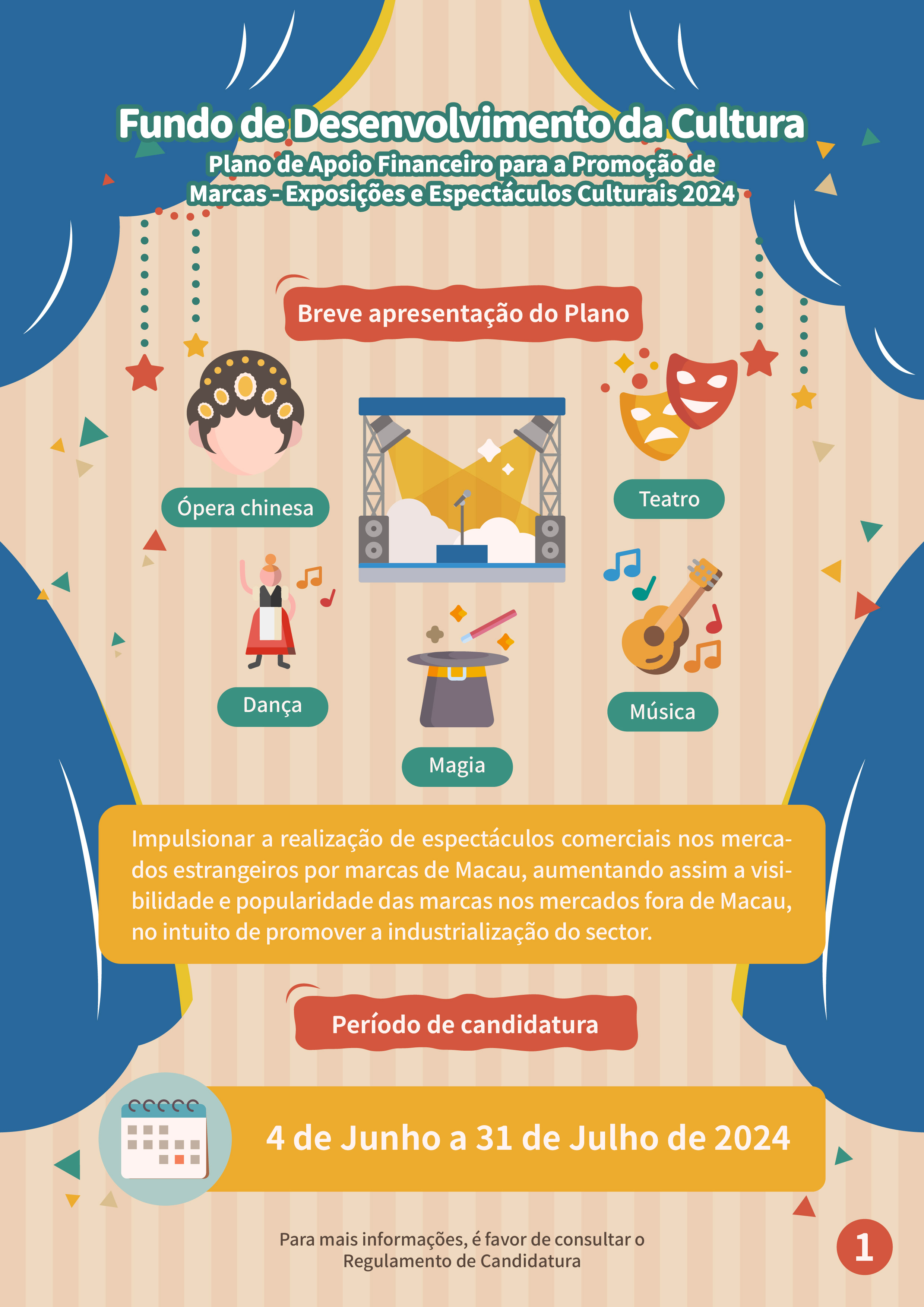 O “Plano de Apoio Financeiro para a Promoção de Marcas - Exposições e Espectáculos Culturais 2024” visa promover as entidades da área de exposição e espectáculo culturais de Macau a transformarem a operação de forma comercial e, aproveitar a cooperação regional para impulsionar a realização de espectáculos comerciais nos mercados estrangeiros por marcas de Macau, especialmente nas regiões de “Grande Baía Guangdong/Hong Kong/Macau” e de “Uma faixa, uma rota”, aumentando assim a visibilidade e popularidade das marcas nos mercados fora de Macau, no intuito de promover a industrialização do sector.