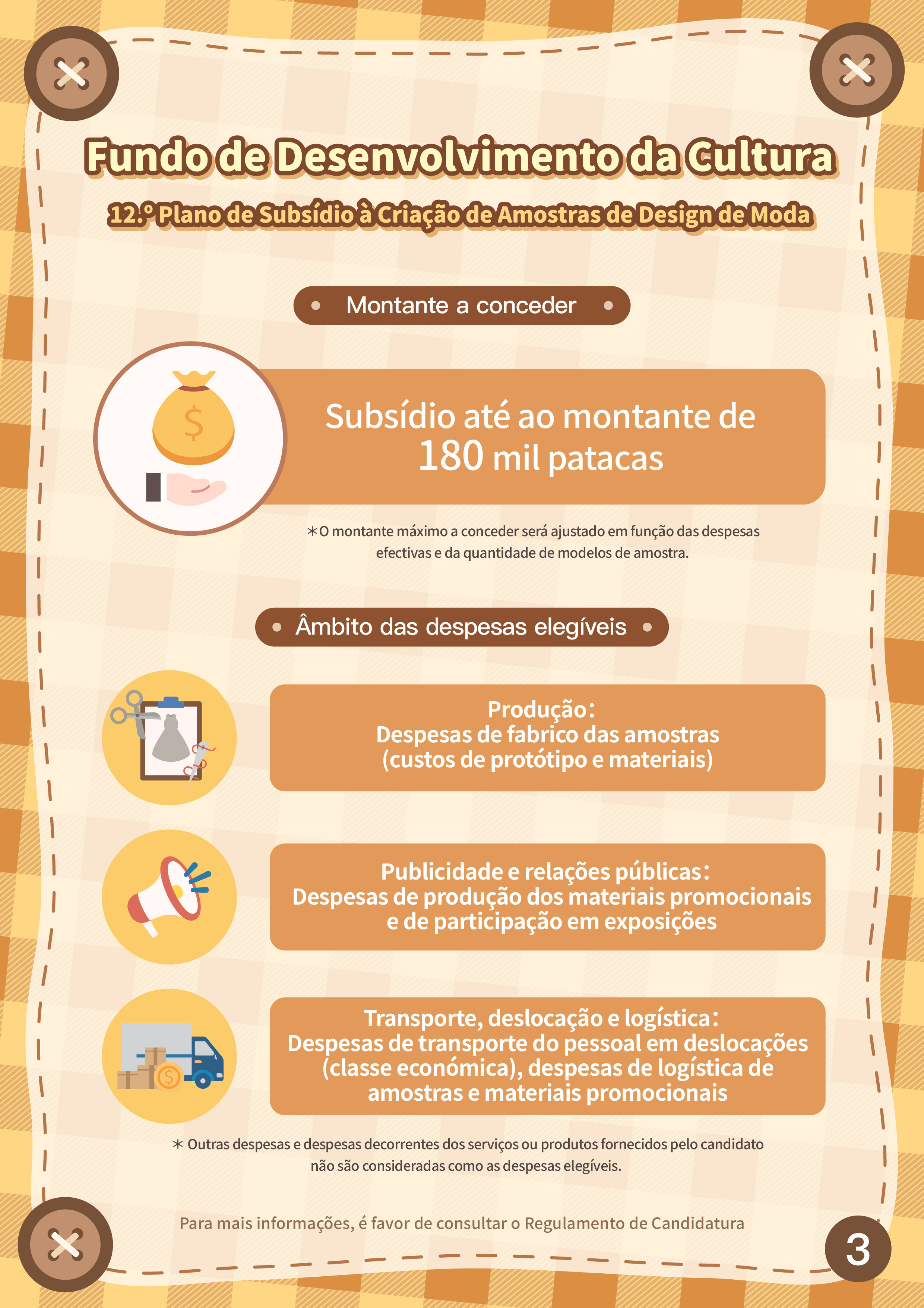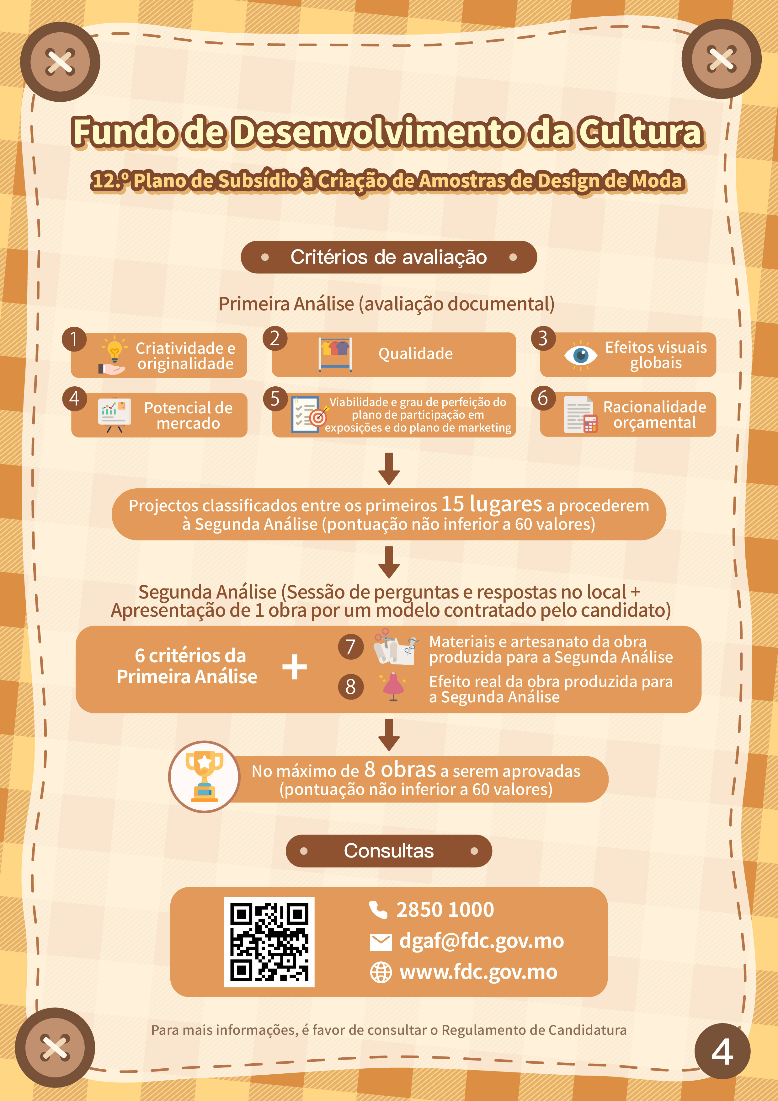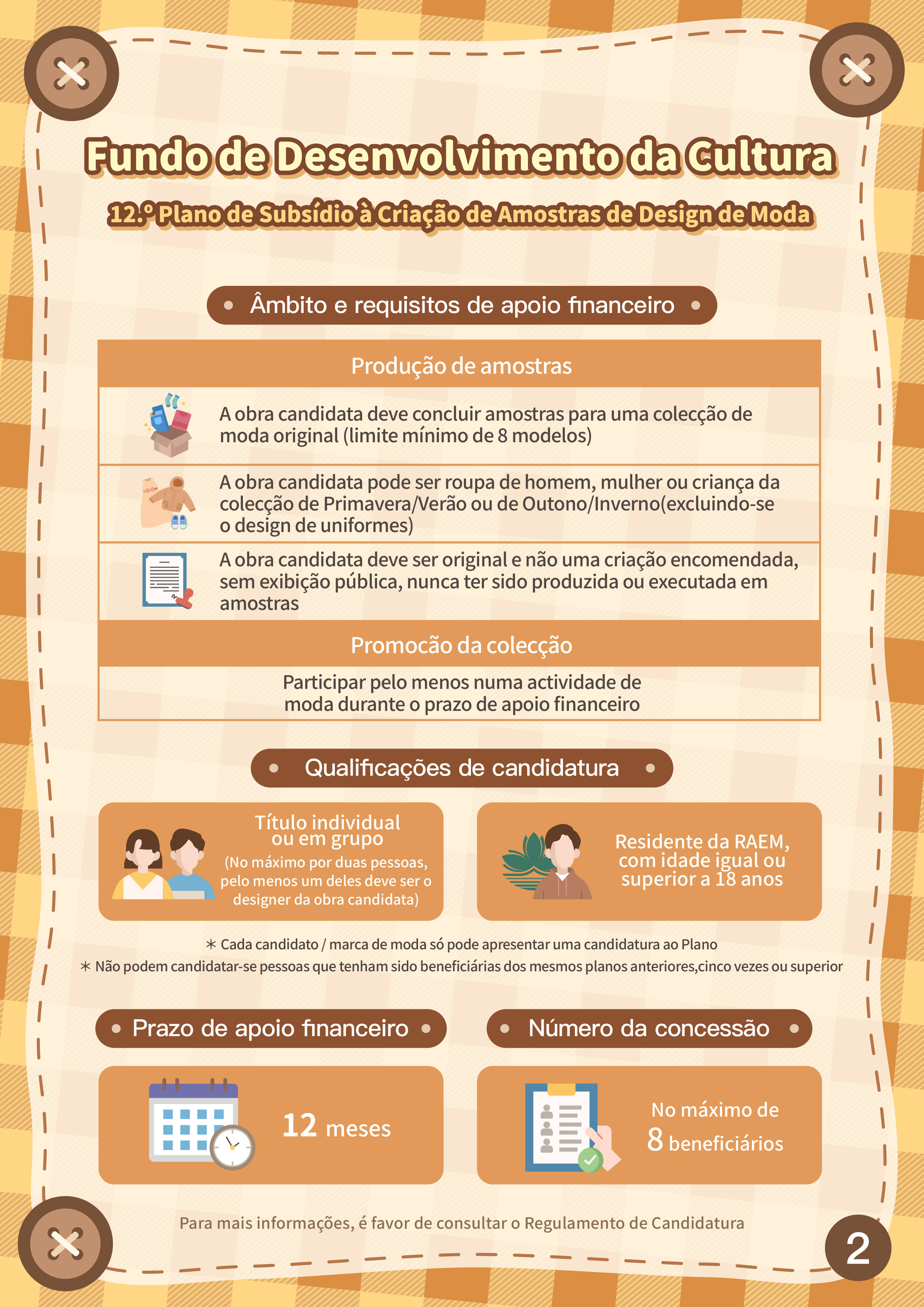 Ainda, serão aceites candidaturas ao “12.º Plano de subsídio à criação de amostras de design de moda”, de 4 de Junho a 12 de Julho, com vista a incentivar a investigação e desenvolvimento inovadores do design de moda local, impulsionar os designers a definir planos de marketing viáveis e promover o desenvolvimento de actividades comerciais ou a participação em exposições de moda de Macau e do exterior, aumentando assim a sua visibilidade e competitividade nos mercados. Os candidatos podem apresentar candidatura a título individual ou em grupo, cujo número mínimo de obras candidatas é de 8 modelos. Os projectos financiados devem participar, pelo menos, numa actividade de moda durante o prazo de apoio financeiro. O processo de avaliação é composto pela Primeira Análise (avaliação documental) e Segunda Análise (sessão de perguntas e respostas no local). Os candidatos que procederão à Segunda Análise devem escolher um modelo para apresentar uma amostra de moda no local, sendo a quota máxima de subsídio de 8 beneficiários.