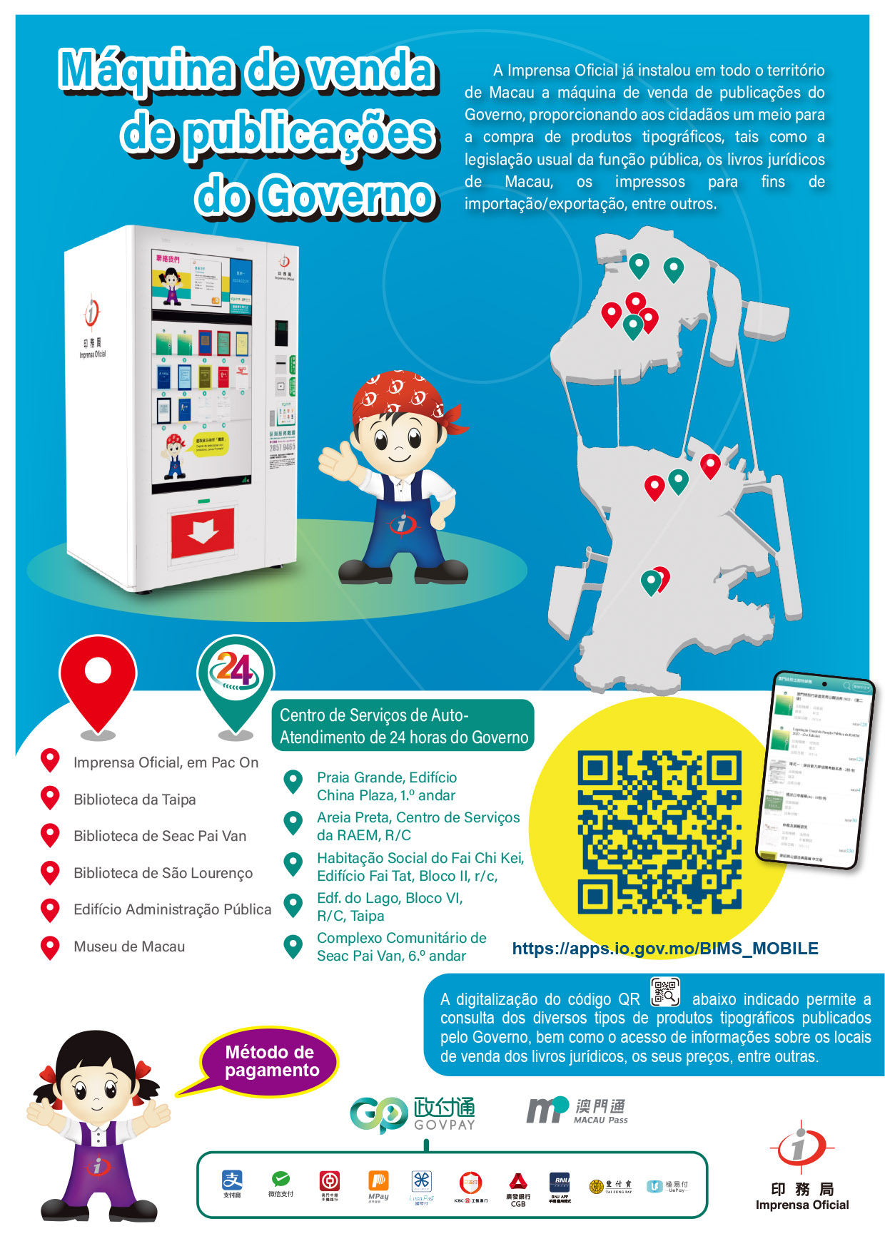 Para facilitar, aos cidadãos e às empresas, a aquisição de publicações dos Serviços Públicos (tais como livros e impressos), a Imprensa Oficial instalou máquinas de venda de publicações do Governo em 5 Centros de Serviços de Auto-Atendimento de 24 horas do Governo, situados na Praia Grande, na Areia Preta, no Fai Chi Kei, no Edifício do Lago e em Seac Pai Van. O modelo destas máquinas é o mais moderno, dispõe de um ecrã de maior dimensão que permite exibir mais informações sobre os produtos e ao mesmo tempo adopta uma concepção completamente inovadora favorável à protecção dos produtos gráficos e à evitação das danificações causadas por raios solares. Para a aquisição de livros, os cidadãos podem digitalizar o código QR com o telemóvel para consultarem o catálogo, bem como aceder à página electrónica do “Serviço Livrarias on-line” da Imprensa Oficial (https://publication.io.gov.mo), consultando, a qualquer momento, a localização das máquinas de venda automática nas diversas zonas e o modelo dos produtos à venda.