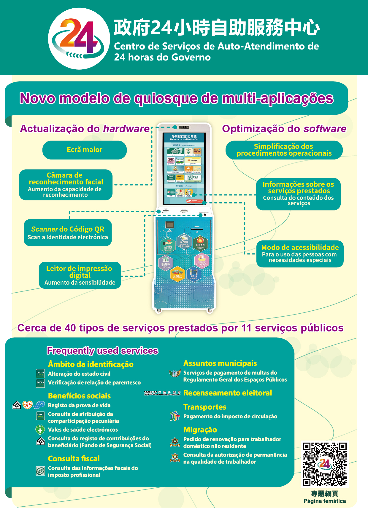Os quiosques de multi-aplicações da DSI, desde a entrada em funcionamento em 2013 até à presente data, registaram mais de 5,19 milhões de utilizações. Com o intuito de incrementar a experiência dos utilizadores, aquela Direcção de Serviços lança novos quiosques de auto-atendimento em sete Centros de Serviços de Auto-Atendimento de 24 horas do Governo, com diversas actualizações no software e no hardware, podendo, deste modo, suportar mais serviços públicos e satisfazer suas diferentes exigências técnicas, permitindo, inclusivamente, a adição de leitor de código QR para a leitura de “Identidade Electrónica”, “Minhas Fotografias” e outras certidões electrónicas disponíveis na Conta Única de Macau. Comparativamente com os quiosques anteriores, foram instalados, nestes quiosques, ecrãs de visualização maiores e actualizadas as lentes de câmara e o leitor de impressões digitais, para se melhorar a técnica de reconhecimento facial e permitir a identificação de uma forma mais precisa e célere. A interface de programação e os procedimentos de operação foram simplificados gradualmente e foi, especialmente, criado um facilitador modo de acessibilidade para pessoas com necessidades especiais.