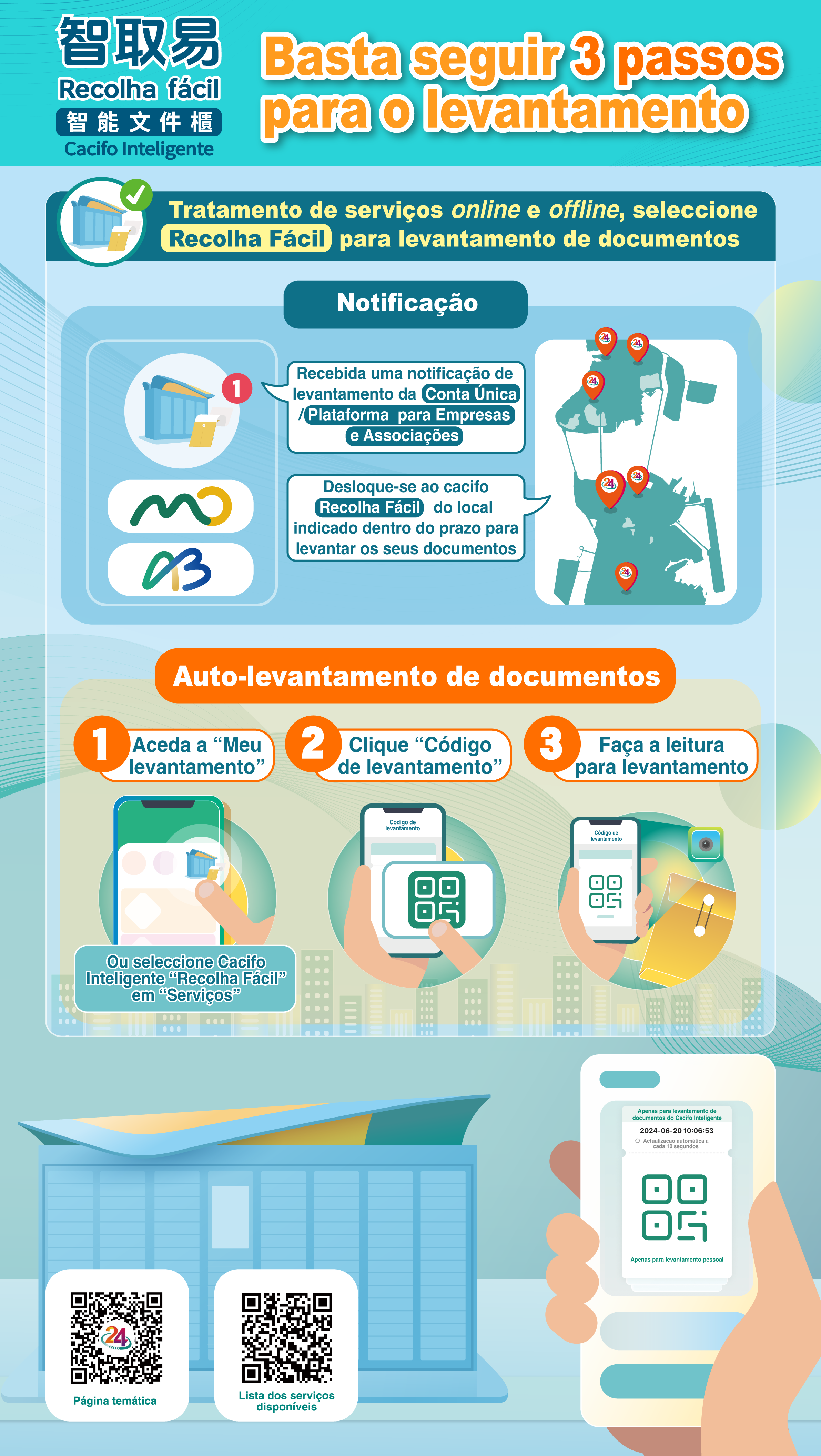 Ao mesmo tempo, em articulação com o lançamento da funcionalidade “Recolha fácil”, é adicionado, nas aplicações de telemóvel da “Conta Única” e da “Plataforma para Empresas e Associações”, o serviço de Cacifo inteligente “Recolha fácil”. Caso os cidadãos necessitem da funcionalidade “levantamento” de documentos, queiram actualizar a versão mais recente das respectivas aplicações de telemóveis.