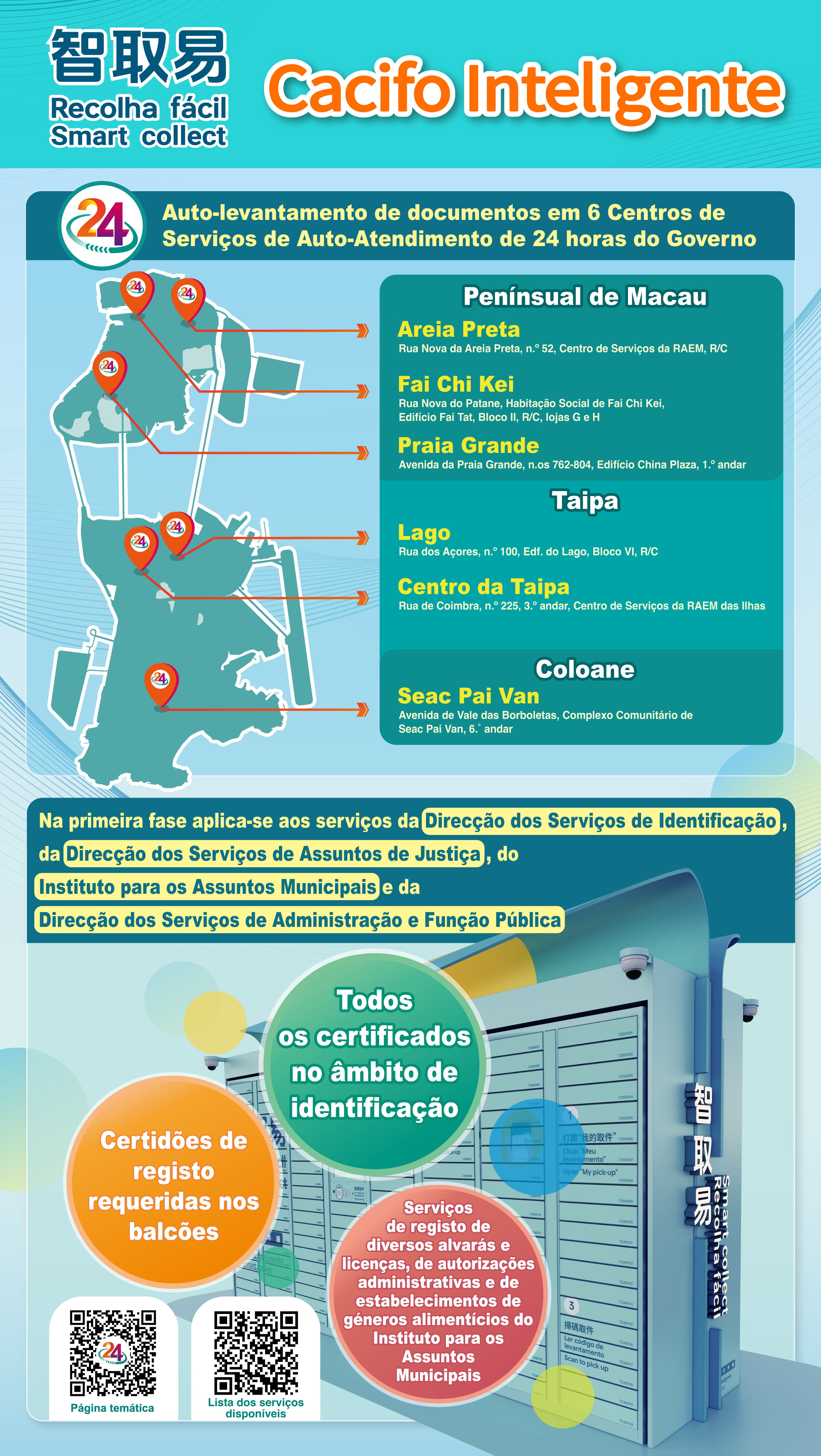 Com o desenvolvimento da governação electrónica, muitos serviços podem ser tratados online, contudo ainda se verifica uma certa necessidade, por parte dos cidadãos, de documentos certificativos emitidos por entidades públicas, nestes termos, é lançado agora o serviço de cacifo “Recolha fácil”, no sentido de proporcionar mais conveniência ao público no levantamento de documentos. A primeira fase do serviço “Recolha fácil” irá aplicar-se a todos os certificados no âmbito da Direcção dos Serviços de Identificação, as certidões de registo requeridas aos balcões da Direcção dos Serviços de Assuntos de Justiça, os serviços de registo de diversos alvarás e licenças, de autorizações administrativas e de estabelecimentos de géneros alimentícios do Instituto para os Assuntos Municipais, bem como, o serviço de tradução de designações de sociedades da Direcção dos Serviços de Administração e Função Pública, abrangendo os serviços online e offline prestados aos cidadãos, às empresas comerciais e às associações.