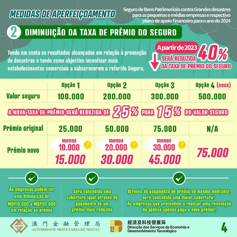 A partir de hoje (dia 21), as pequenas e médias empresas (PMEs) podem subscrever um “Seguro contra grandes desastres” para cada estabelecimento comercial, através das cinco seguradoras de Macau, participantes no programa supramencionado para o ano de 2024. No âmbito deste programa, existem quadros montantes seguros à escolha dos comerciantes, nomeadamente de MOP100.000, MOP200.000 e MOP300.000 e MOP500.000 (o último foi estabelecido no ano passado). Por outro lado, será dada a continuidade à medida de concessão de descontos nos prémios aos comerciantes que nunca apresentaram pedido de indemnização aquando da renovação de seguro, com descontos máximos de 35%.