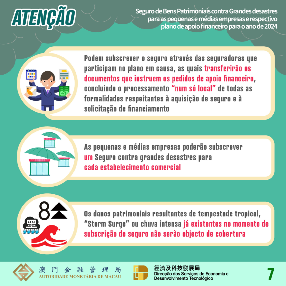 A subscrição do “Seguro de bens patrimoniais contra grandes desastres para as pequenas e médias empresas” (adiante designado por “Seguro contra grandes desastres”) e a apresentação do pedido do “Plano de apoio financeiro a conceder no âmbito do seguro de bens patrimoniais contra grandes desastres para as pequenas e médias empresas” (adiante designado por “Plano de apoio financeiro”) para o ano de 2024 serão aceites a partir do dia 21 de Junho até 31 de Dezembro do corrente ano. Em simultâneo, o Fundo de Desenvolvimento Industrial e de Comercialização continua a implementar medidas complementares como o designado “Plano de apoio financeiro”, no sentido de aliviar os encargos financeiros dos comerciantes.