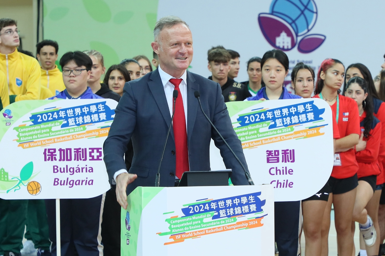 Realizou-se, no dia 24 de Junho, no Pavilhão Polidesportivo Tap Seac, a cerimónia de abertura do Campeonato Mundial de Basquetebol para Alunos do Ensino Secundário de 2024 (“Campeonato”), organizado pela Federação Internacional de Desporto Escolar (na sigla inglesa, ISF) e realizado pela Direcção dos Serviços de Educação e de Desenvolvimento da Juventude (DSEDJ). Na ocasião, a representante do Chefe do Executivo da Região Administrativa Especial de Macau (RAEM) e Secretária para os Assuntos Sociais e Cultura, Ao Ieong U, anunciou a abertura oficial do Campeonato Mundial de Basquetebol para Alunos do Ensino Secundário de 2024, dando início à realização, pela primeira vez, em Macau, de um evento internacional de basquetebol para alunos do ensino secundário. A presente edição do Campeonato atraiu a participação de 37 equipas provenientes de 20 países e regiões.