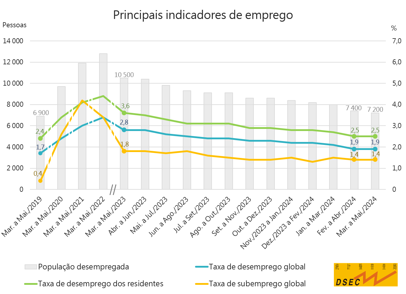 Entre Março e Maio de 2024 a taxa de desemprego global (1,9%) e a taxa de desemprego dos residentes (2,5%) mantiveram-se ambas idênticas às do período passado (Fevereiro a Abril de 2024), após terem caído por dois períodos consecutivos. Estes dois indicadores aproximaram-se dos níveis do período de Março a Maio de 2019. A taxa de subemprego manteve-se em 1,4%, informam os Serviços de Estatística e Censos.