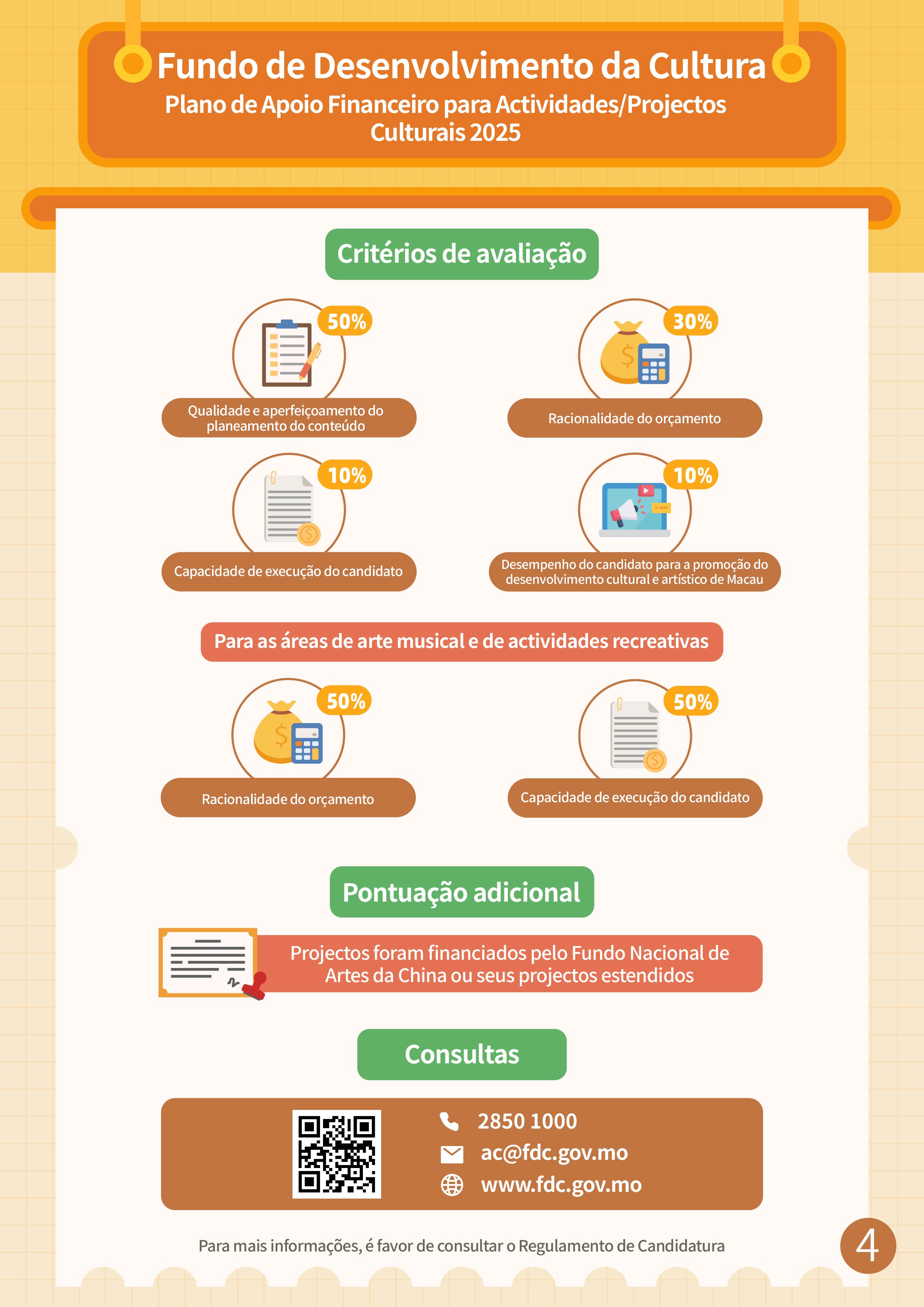 A apresentação de candidaturas ao “Plano de Apoio Financeiro para Actividades/Projectos Culturais 2025” terá lugar de 1 a 26 de Agosto. O âmbito de apoio financeiro inclui as actividades/projectos relacionados com as artes visuais, criação literária, música, arte musical (incluindo diálogo musical, destaques de óperas, apenas sob a forma de actuações) e actividades recreactivas (canções clássicas e populares, apenas sob a forma de actuações), teatro, dança, património cultural tangível, património cultural intangível (incluindo óperas cantonesas), moda, design, cinema e televisão, animação.