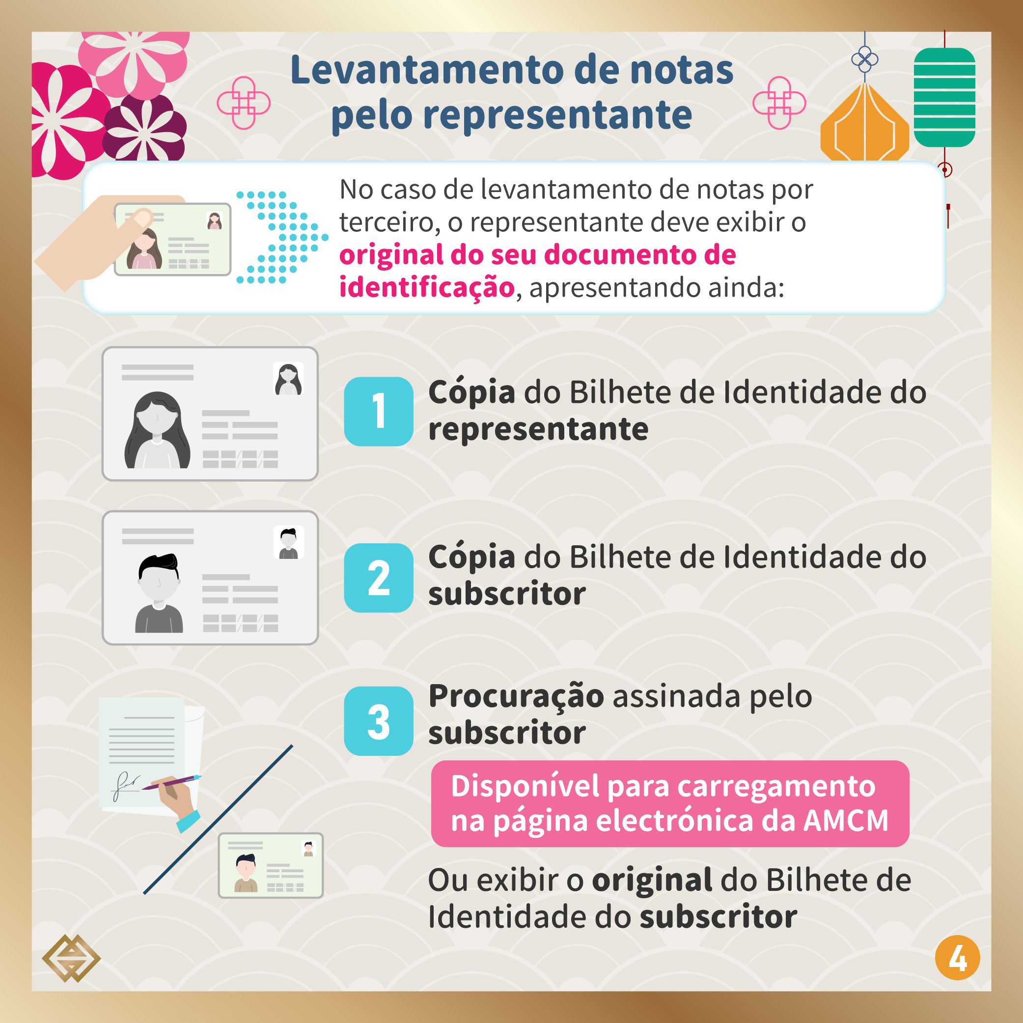 Ora, o período de troca decorre de 16 de Setembro a 6 de Dezembro de 2024. Assim, os residentes que tenham efectuado a subscrição para efeitos de troca pessoal ou no caso de designação de terceiros, devem comparecer, na data previamente agendada, no local indicado para a troca das notas, munidos dos documentos necessários e do respectivo montante das notas a serem trocadas. As informações detalhadas podem ser consultadas junto da página electrónica da AMCM: https://registration.amcm.gov.mo/banknotes/terms_pt.html. Para quaisquer esclarecimentos, favor contactar a linha aberta da AMCM durante o horário de expediente (telefone n.os 28565071/28565072)