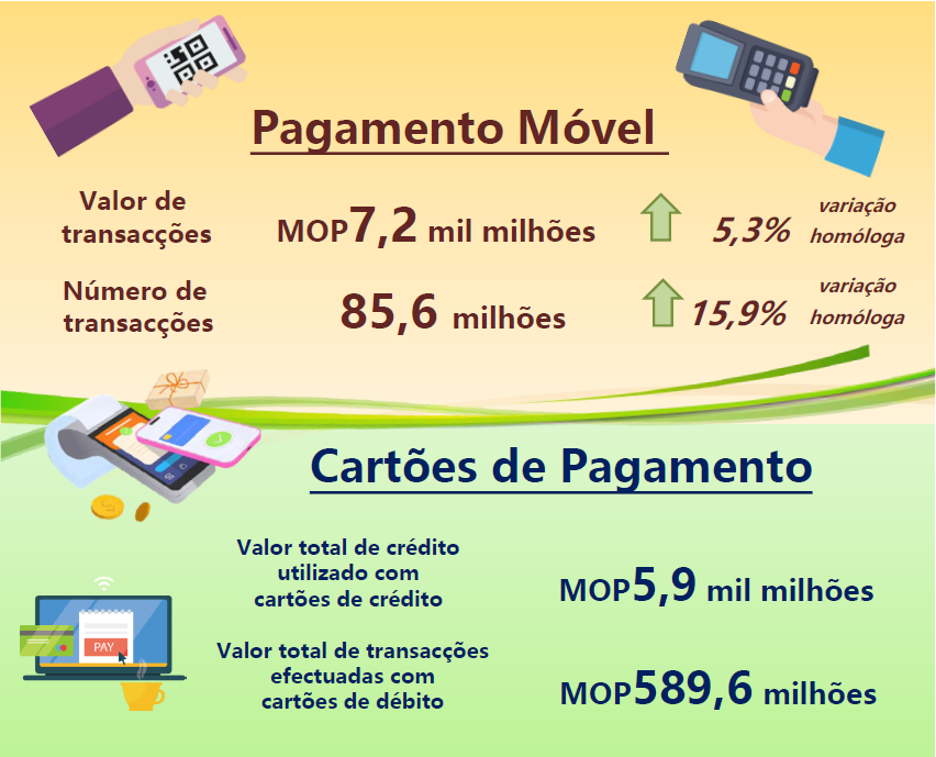 No domínio dos pagamentos móveis locais, o número de transacções realizadas, no segundo trimestre de 2024, aumentou 15,9% relativamente ao ano anterior, tendo registado 85,6 milhões transacções. O valor das transacções foi de MOP7,2 mil milhões, correspondendo a um acréscimo de 5,3%, quando comparado com o ano anterior. O valor médio por transacção foi de MOP83,8. Até finais de Junho de 2024, o número de aparelhos que aceitam o pagamento móvel e os suportes de “QR Code” em Macau atingiu 102.667 unidades.