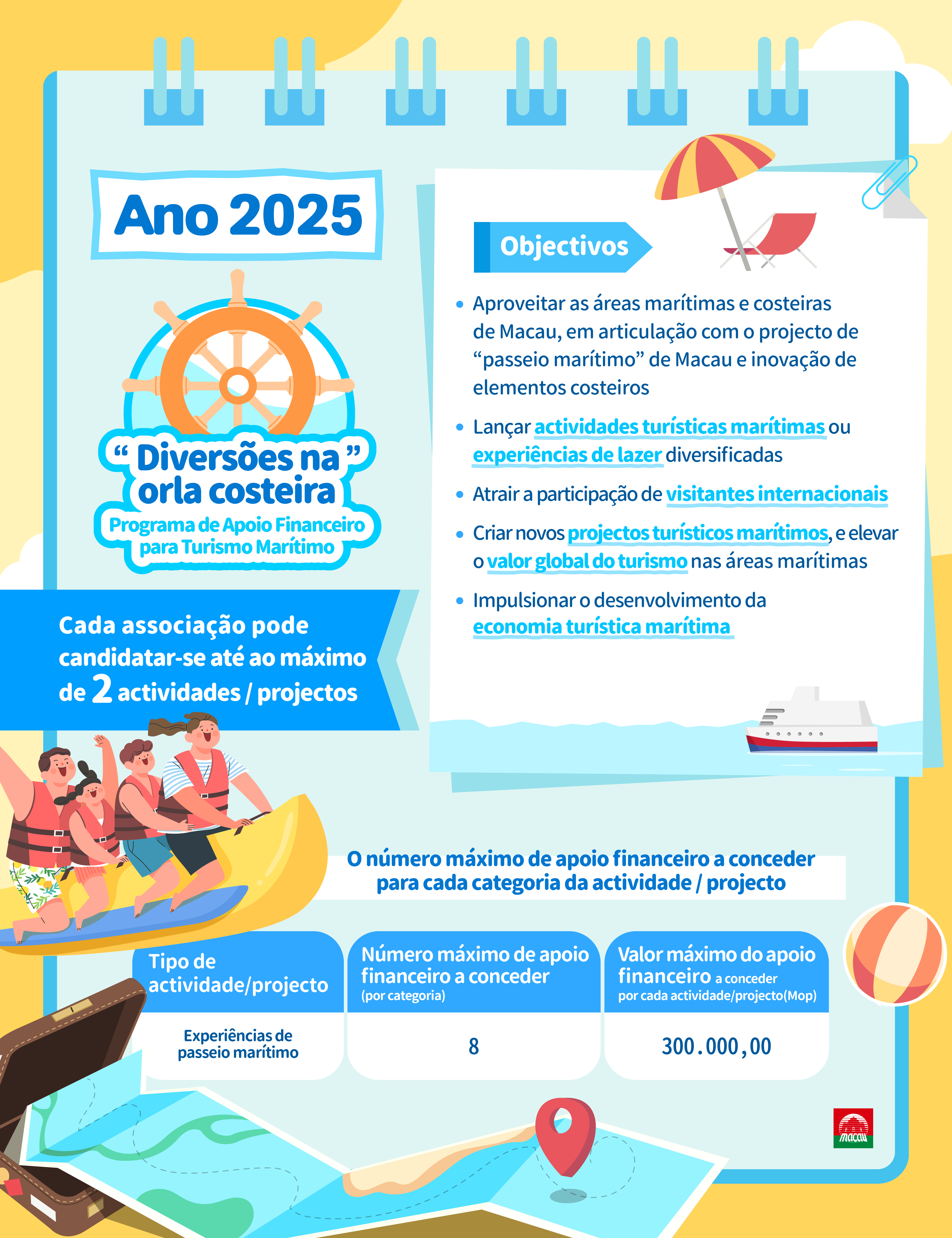 Programa de Apoio Financeiro ao Turismo Marítimo “Diversões na orla costeira”: Aproveita as áreas marítimas e costeiras de Macau, em articulação com o projecto de passeio marítimo de Macau e a inovação dos elementos costeiros, para lançar actividades de turismo costeiro diversificadas ou experiências de lazer, atraindo a participação de visitantes nacionais e estrangeiros, de modo a explorar projectos de turismo marítimo e aumentar o valor turístico global da zona costeira, impulsionando o desenvolvimento económico do turismo costeiro.