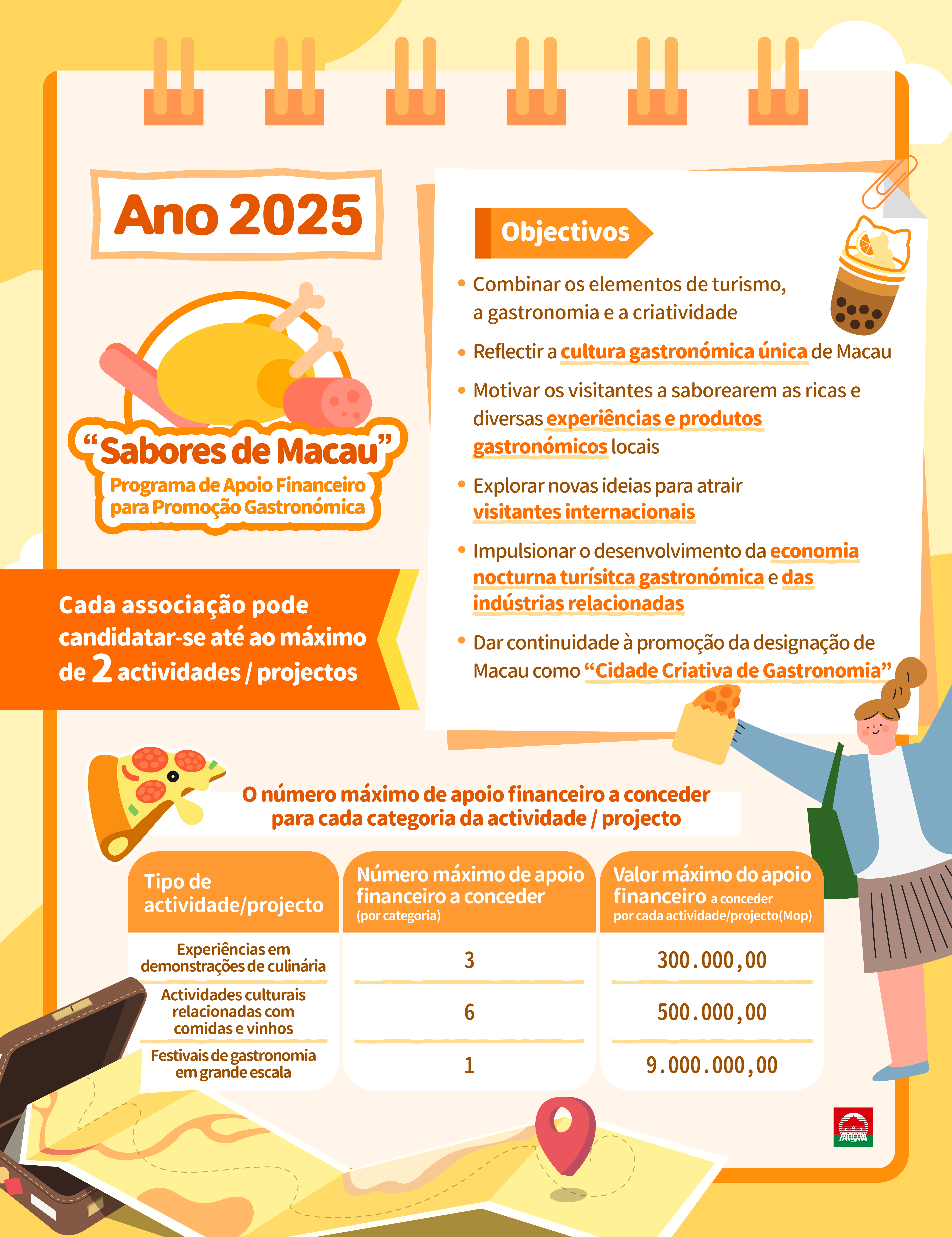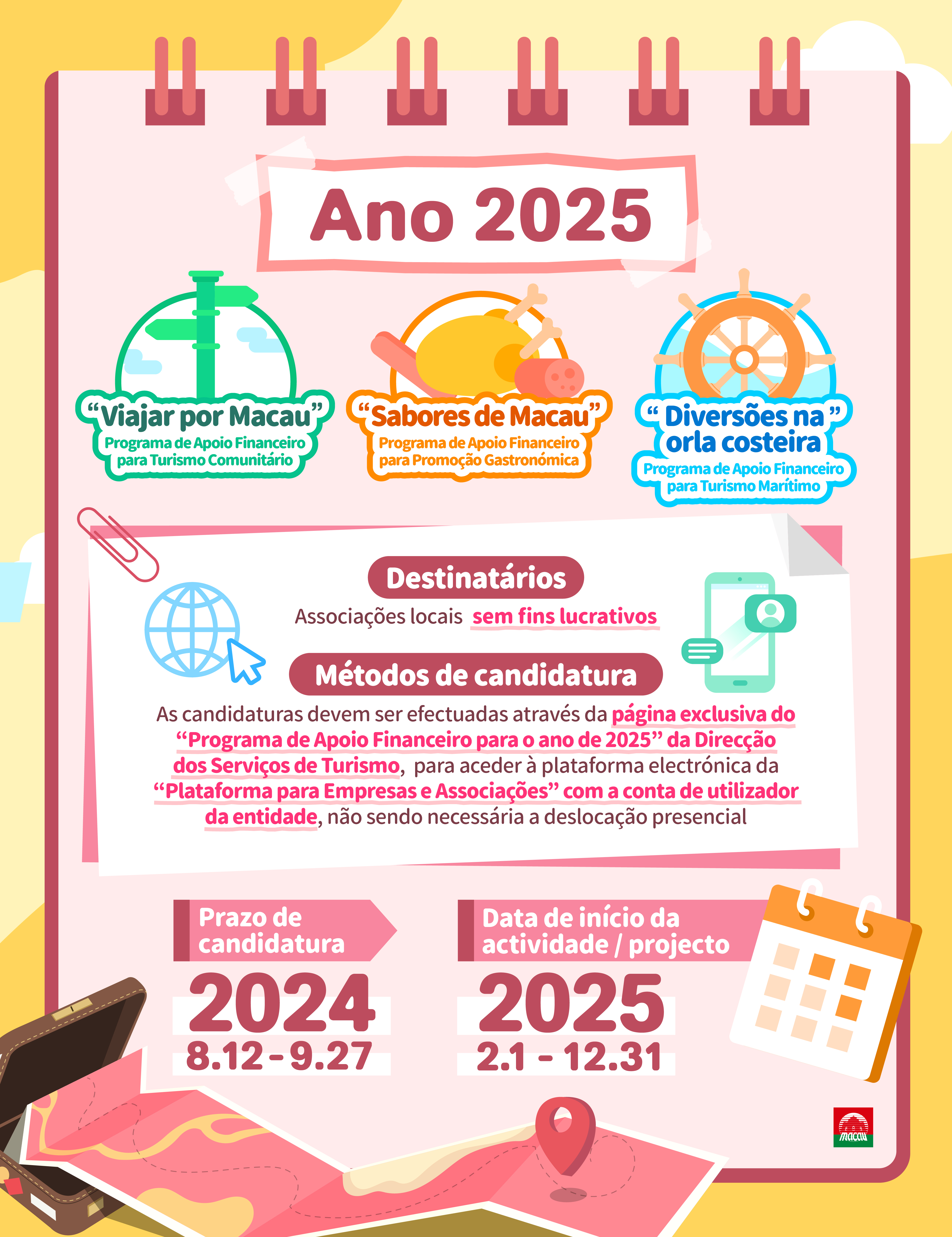 As candidaturas aos programas de apoio financeiro para o Turismo Comunitário “Viajar por Macau”, Promoção Gastronómica “Sabores de Macau” e Turismo Marítimo “Diversões na orla costeira” da Direcção dos Serviços de Turismo (DST) para o ano de 2025 estarão abertas entre 12 de Agosto e 27 de Setembro deste ano. As candidaturas têm de ser apresentadas na página electrónica do “Programa de Apoio Financeiro para 2025” da DST, através da conta de utilizador na Plataforma para Empresas e Associações.
