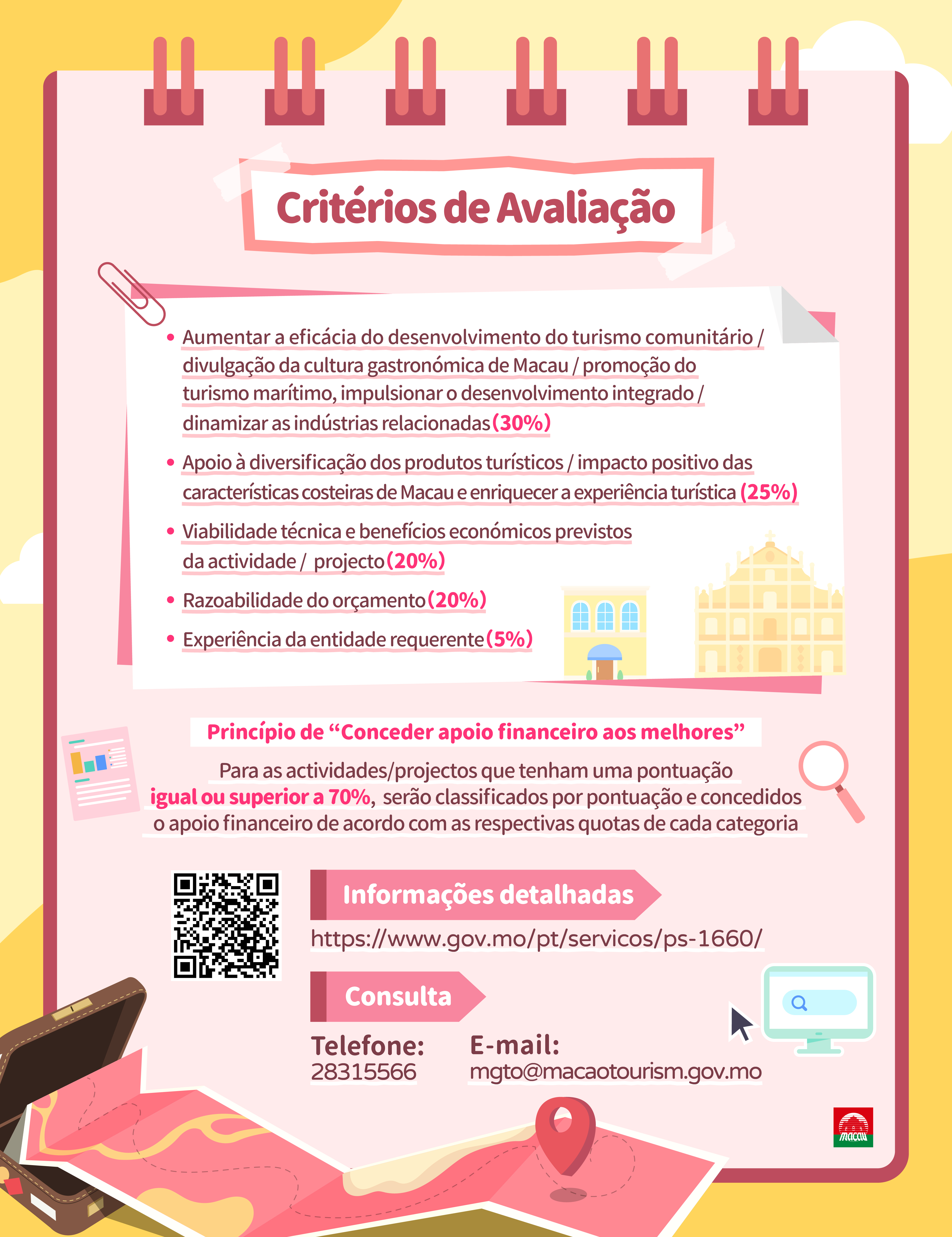 O Fundo de Turismo irá, através dos critérios de avaliação para cada programa de apoio financeiro específico, avaliar e analisar prudentemente todos os pedidos e “conceder apoio financeiro aos melhores”. Para mais informações sobre as candidaturas aos três programas de apoio financeiro do ano de 2025, visitar https://www.gov.mo/pt/servicos/ps-1660/.