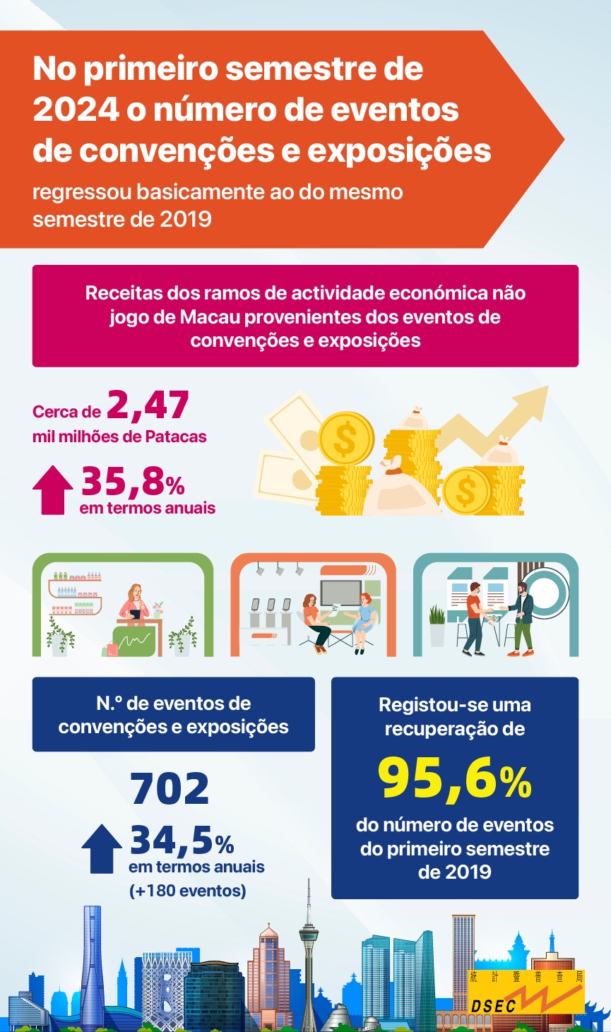 No primeiro semestre de 2024 realizaram-se em Macau 702 eventos de convenções e exposições, mais 34,5% (+180 eventos), em termos anuais, registando-se uma recuperação de 95,6% do número de eventos de convenções e exposições do primeiro semestre de 2019 (734 eventos). Estimou-se que as receitas dos ramos de actividade económica não jogo de Macau provenientes dos eventos de convenções e exposições atingiram aproximadamente 2,47 mil milhões de Patacas no primeiro semestre de 2024, mais 35,8%, face às do mesmo semestre de 2023 (1,82 mil milhões de Patacas), informam os Serviços de Estatística e Censos.