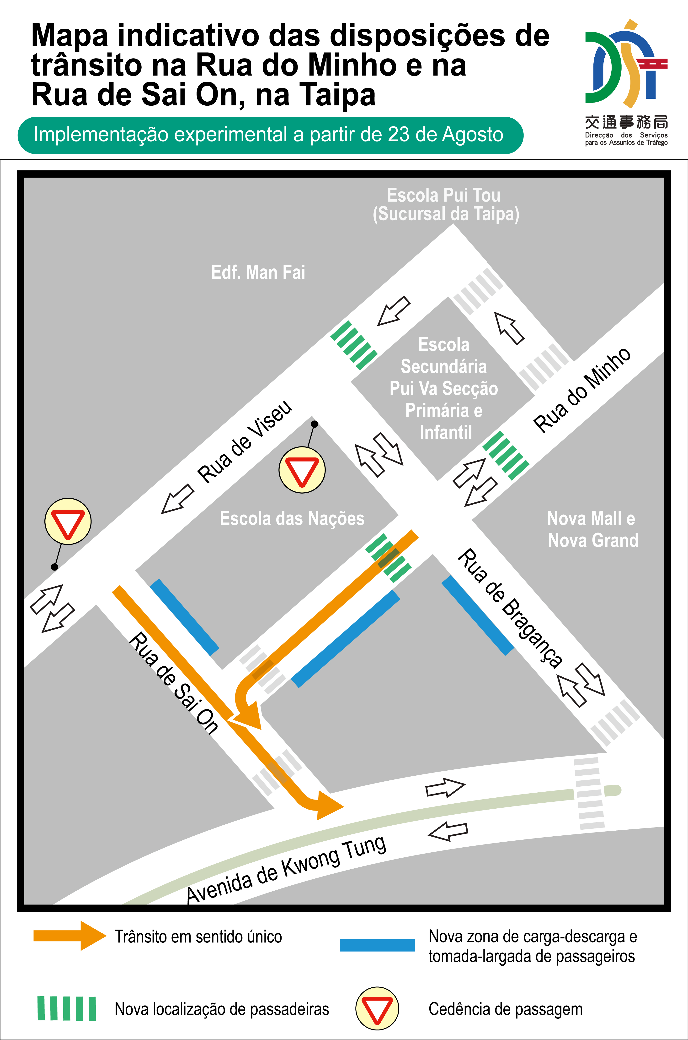 Em paralelo, em resposta à inauguração de novas instalações escolares este ano, a DSAT optimizou as instalações de trânsito e apoio nas áreas circundantes. Por exemplo, na Taipa, será implementado, a título experimental, o sentido único de circulação num troço da Rua do Minho entre a Rua de Sai On e a Rua de Bragança, bem como na Rua de Sai On. Serão simultaneamente ajustadas as localizações de alguns cruzamentos com prioridade de passagem e de passadeiras, bem como aumentadas as zonas de tomada e largada de passageiros e mercadorias, com o objectivo de melhorar a ordem rodoviária. Considerando que alguns pais e condutores possam não estar familiarizados com as novas medidas de trânsito nos primeiros dias do ano lectivo, a DSAT e a DSEDJ irão reforçar a divulgação das informações relevantes, e o CPSP destacará mais agentes para o controlo do trânsito no local. Além disso, em articulação com a abertura de duas novas escolas em Coloane, a DSAT optimizou a organização do trânsito na Rua das Schimas e nas vias circundantes, bem como o ambiente pedonal nas imediações da escola na Rua de Afonso de Albuquerque, com o intuito de aperfeiçoar a ordem de travessia de peões e de circulação de veículos. Simultaneamente, procedeu-se ao ajuste dos lugares de estacionamento para aumentar a visibilidade entre condutores e peões nas proximidades das passadeiras, reforçando assim a segurança dos docentes e alunos ao atravessarem a rua.