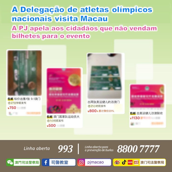 Recentemente, a Polícia Judiciária descobriu que algumas pessoas estavam a vender bilhetes para o evento “O nosso orgulho! – Encontro com a Delegação de Atletas Olímpicos Nacionais em Macau” em plataformas de redes sociais.