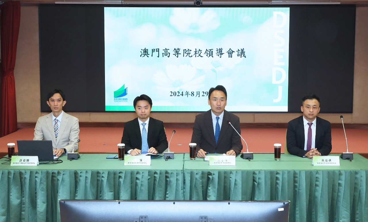 A Direcção dos Serviços de Educação e de Desenvolvimento da Juventude (DSEDJ) realizou, no dia 29 de Agosto, uma reunião com dirigentes das instituições do ensino superior de Macau, para discussão e troca de opiniões sobre assuntos pedagógicos e trabalhos dos estudantes do novo ano lectivo. A reunião foi presidida pelo director da DSEDJ, Kong Chi Meng e contou com a participação dos subdirectores da DSEDJ, Teng Sio Hong e Wong Ka Ki e dos respectivos chefes da Direcção de Serviços, bem como dos dirigentes e representantes das 10 instituições do ensino superior de Macau.