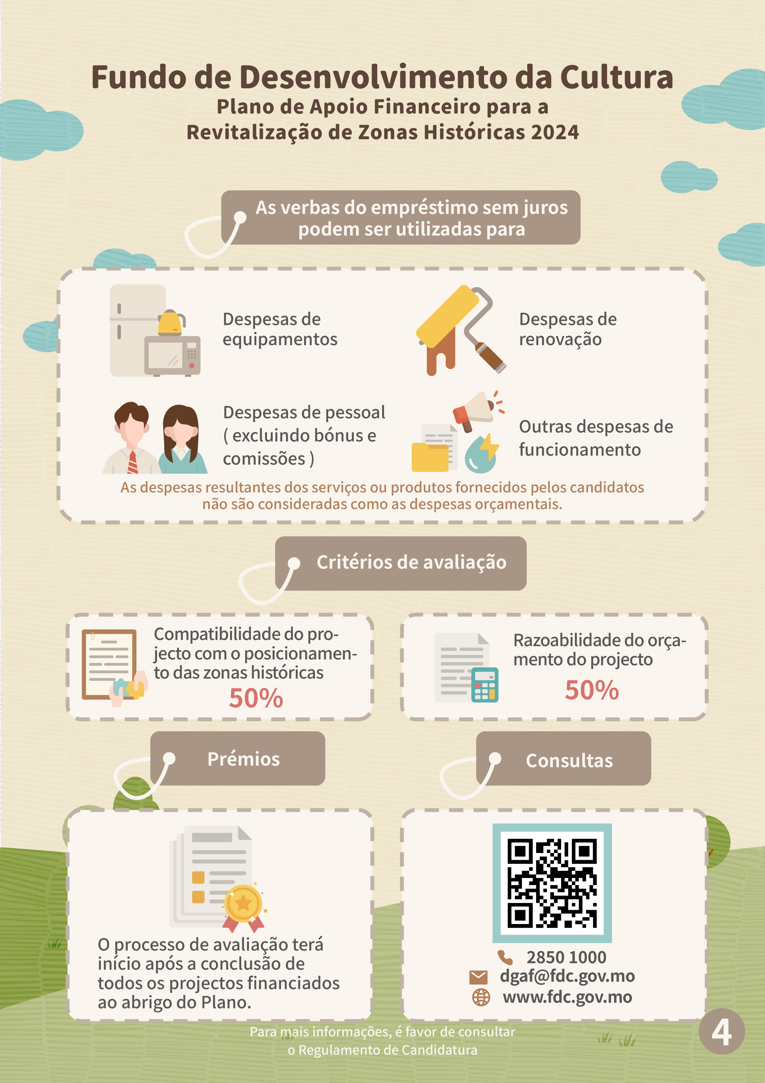 O Fundo de Desenvolvimento da Cultura (adiante designado por “FDC”) aceitará candidaturas ao “Plano de apoio financeiro para a revitalização de zonas históricas 2024” (adiante designado por “Plano”) de 10 de Setembro a 30 de Dezembro, visando incentivar as empresas a explorarem lojas ou espaços em articulação com o posicionamento de cada zona, cultivar projectos comerciais com características distintas e criar uma atmosfera activa nas zonas e impulsionar a vitalidade das zonas históricos, premiando ainda projectos que tenham contribuído para a promoção do desenvolvimento das zonas históricas durante o período de funcionamento.