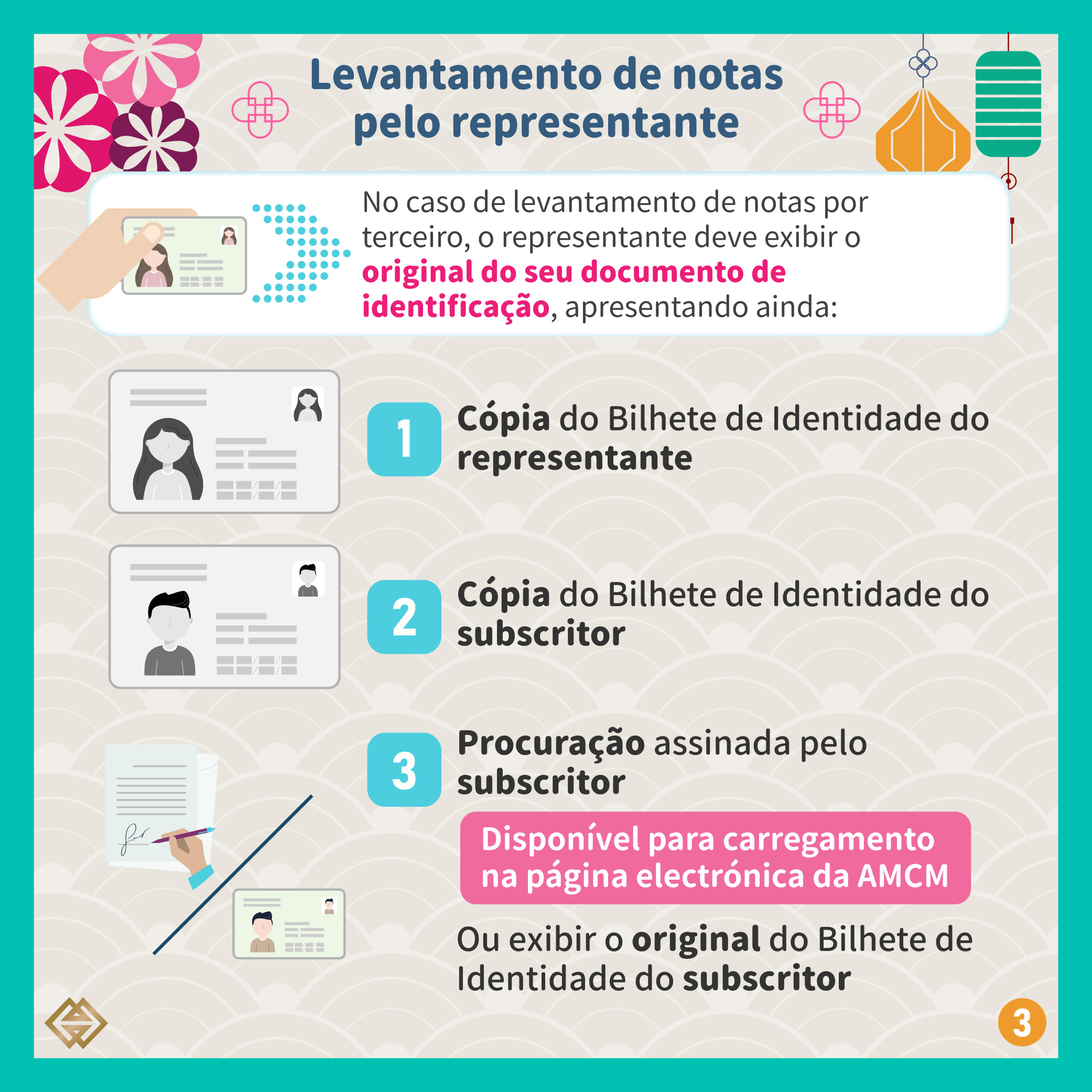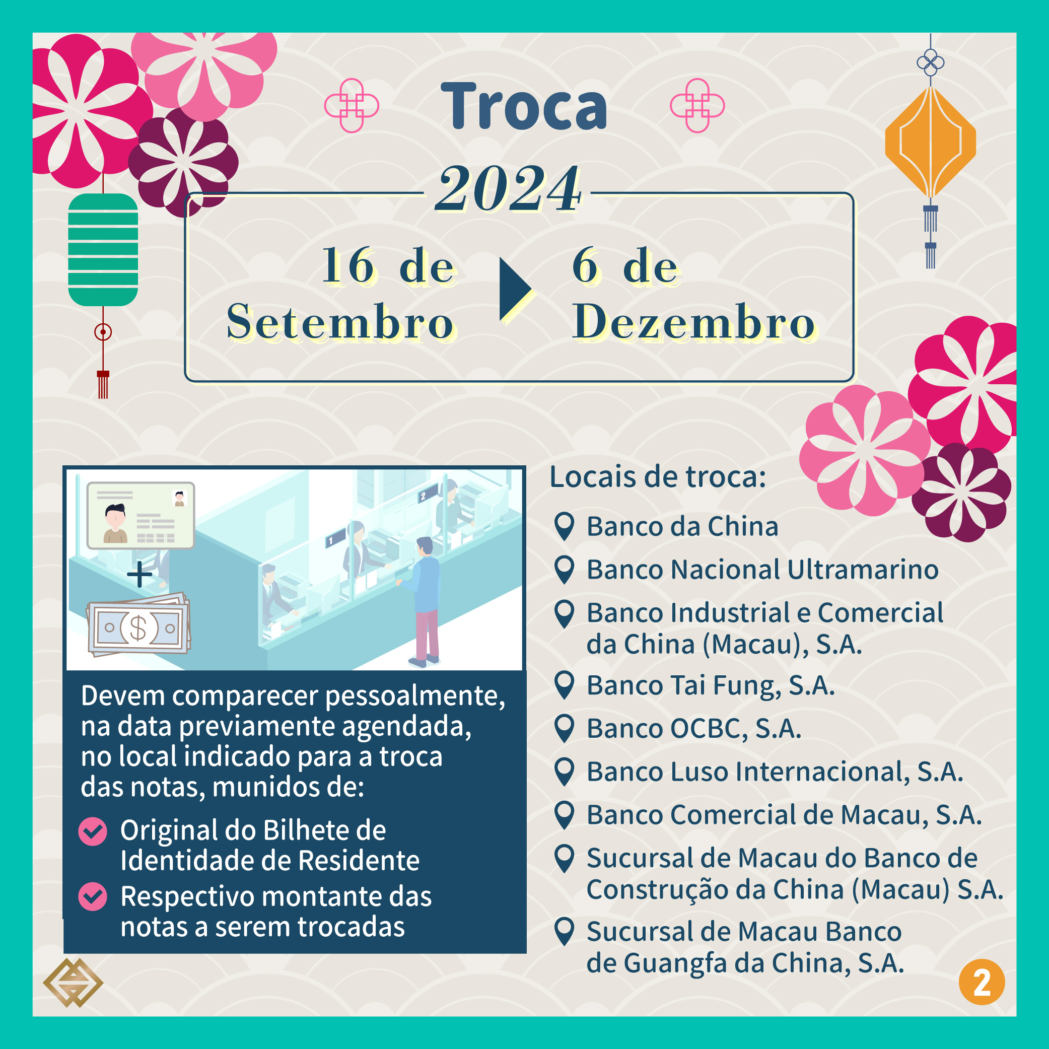 O prazo de troca decorrerá entre 16 de Setembro de 2024 e 6 de Dezembro de 2024. Os subscritores devem fazer-se acompanhar dos documentos exigidos e do dinheiro de troca, comparecer, pessoalmente ou designar o seu representante, na data previamente agendada e na agência indicada para a troca das notas, podendo consultar a página electrónica da AMCM: https://registration.amcm.gov.mo/banknotes/terms_pt.html ou contactar a linha exclusiva da AMCM: 2856 5071 / 2856 5072, durante o horário de expediente, para quaisquer esclarecimentos.