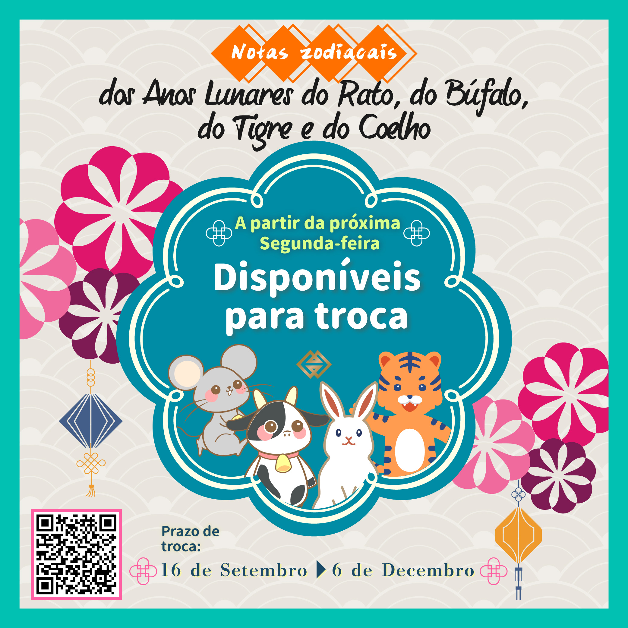 Foi concluída com sucesso a subscrição “on-line” das notas zodiacais dos Anos Lunares do Rato, do Búfalo, do Tigre e do Coelho emitidas pelos dois bancos emissores, as quais estarão disponíveis para troca a partir da próxima Segunda-feira (dia 16), junto dos bancos participantes.