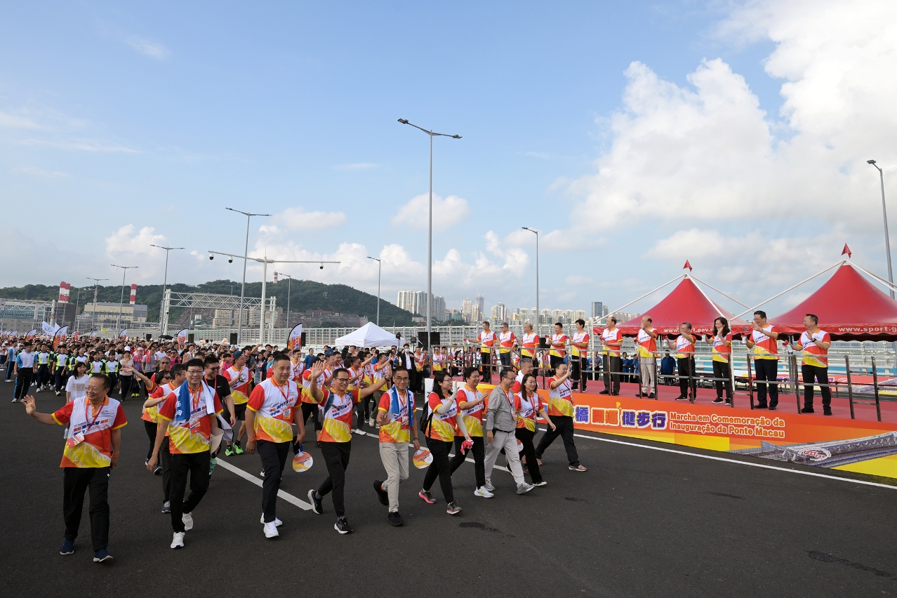 Em comemoração do 75.º Aniversário da Implantação da República Popular da China e do 25.º Aniversário do Estabelecimento da Região Administrativa Especial de Macau, o Instituto do Desporto realizou hoje (dia 29), às 08H00 da manhã, a “Marcha em Comemoração da Inauguração da Ponte Macau” antes da sua inauguração. O evento atraiu a participação de cerca de 21.000 residentes e o percurso começa no viaduto de acesso da Ponte Macau do lado de Pak On Taipa, segue para o viaduto de acesso da Ponte Macau perto da zona A e daí volta para o local de partida (lado de Pak On), com uma distância total de cerca de 6km.