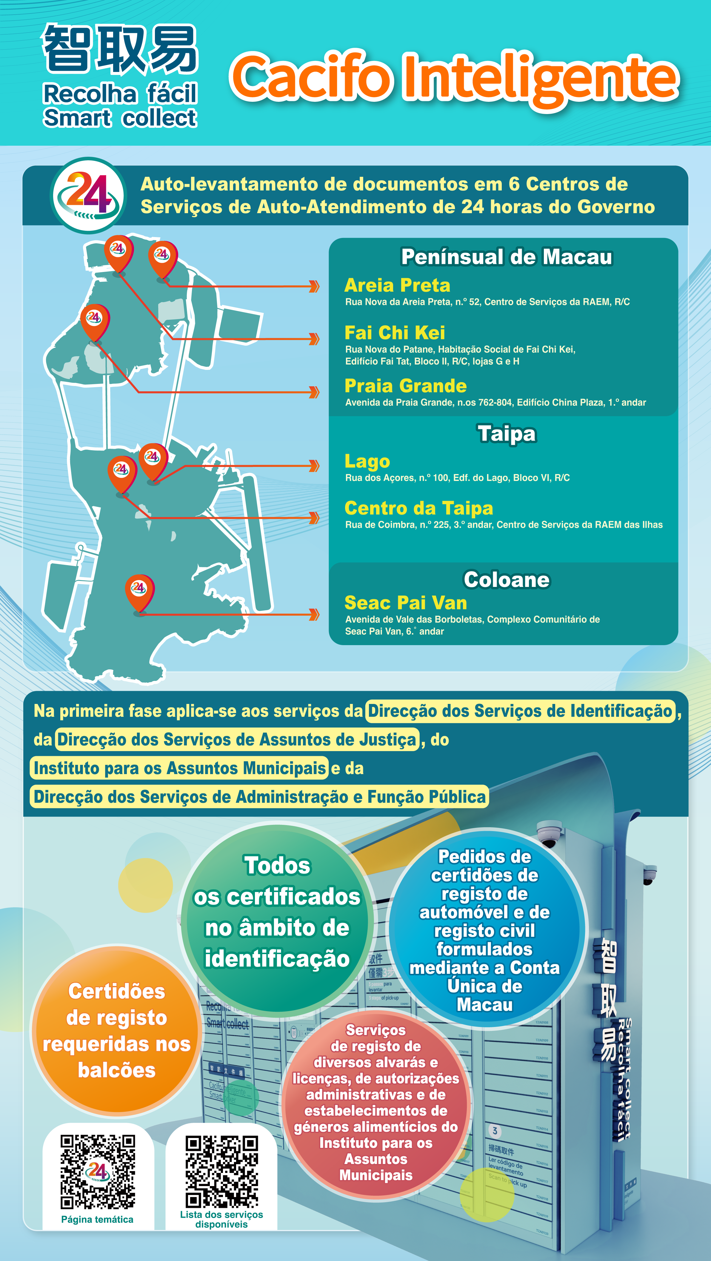 Os cacifos inteligentes da “Recolha fácil” encontram-se localizados, actualmente, em seis Centros de Serviços de Auto-Atendimento de 24 horas do Governo, nomeadamente da Praia Grande, Areia Preta, Fai Chi Kei, Centro da Taipa, Lago e Seac Pai Van. Para o levantamento de documentos, os cidadãos apenas necessitam de aceder ao código de levantamento na Conta Única de Macau ou na Plataforma para Empresas e Associações e efectuar a leitura do código para confirmar o levantamento.