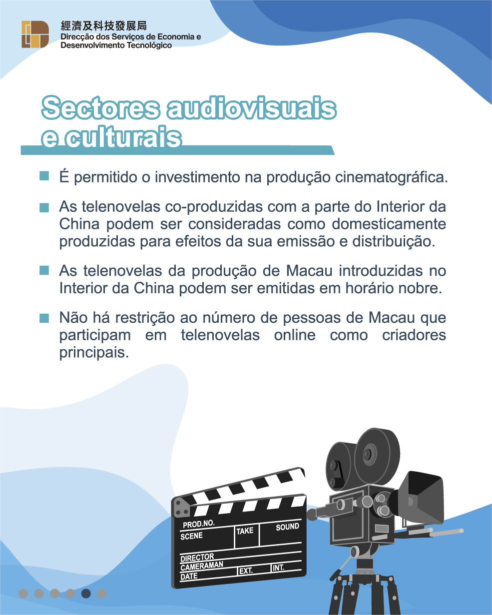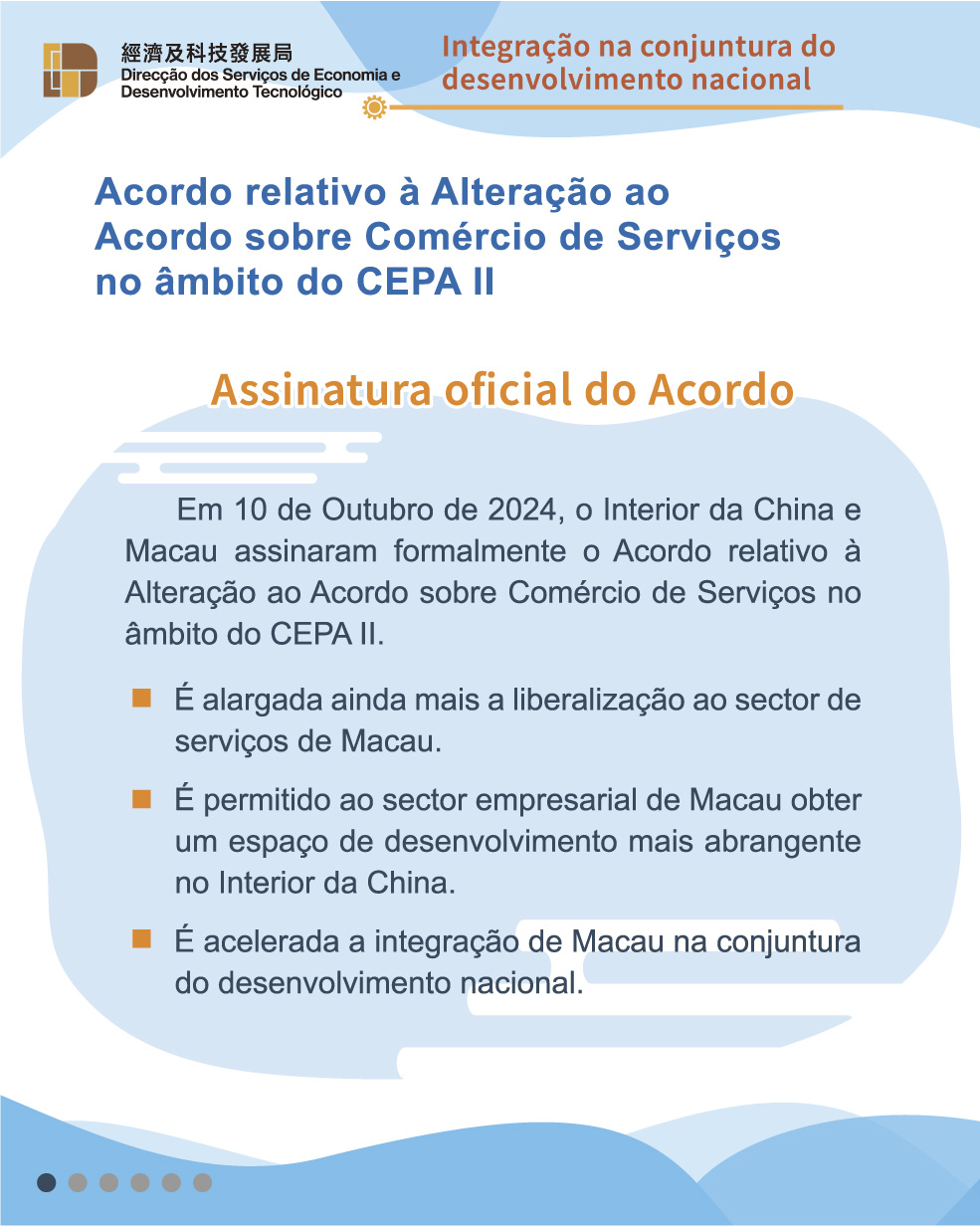 No Acordo relativo à Alteração II, são acrescentadas medidas de liberalização nos sectores de serviços de tecnologia de ponta, financeiros, audiovisuais e culturais, com vista a apoiar a estratégia de desenvolvimento da diversificação adequada da economia de Macau “1 + 4”, criando um novo espaço para o desenvolvimento da diversificação adequada da economia de Macau. No sector de tecnologia, as empresas de Macau certificadas no âmbito do “Programa de Certificação de Empresas de Tecnologia”, desde que reúnam os requisitos, são consideradas como as empresas de tecnologia de ponta no Interior da China em termos de recebimento do tratamento igual, execptuando os benefícios fiscais; é permitido aos prestadores de serviços de Macau que preencham os respectivos requisitos obterem no Interior da China as respectivas qualificações técnicas; é eliminado o limite da percentagem do capital social detida pelas empresas de Macau na prestação de serviços de centros de dados da Internet nas zonas piloto. No sector dos serviços financeiros, é eliminado o requisito do exercício, pelo menos 5 anos, de actividade comercial substancial para os bancos de Macau e é eliminada a restrição relativa ao activo total no fim do ano das instituições financeiras estrangeiras para a sua participação social em seguradoras, entre outros. Nos sectores audiovisuais e culturais, é permitido às empresas de Macau investirem na produção cinematográfica e as telenovelas co-produzidas com a parte do Interior da China podem ser consideradas como domesticamente produzidas para efeitos da sua emissão e distribuição, entre outros.