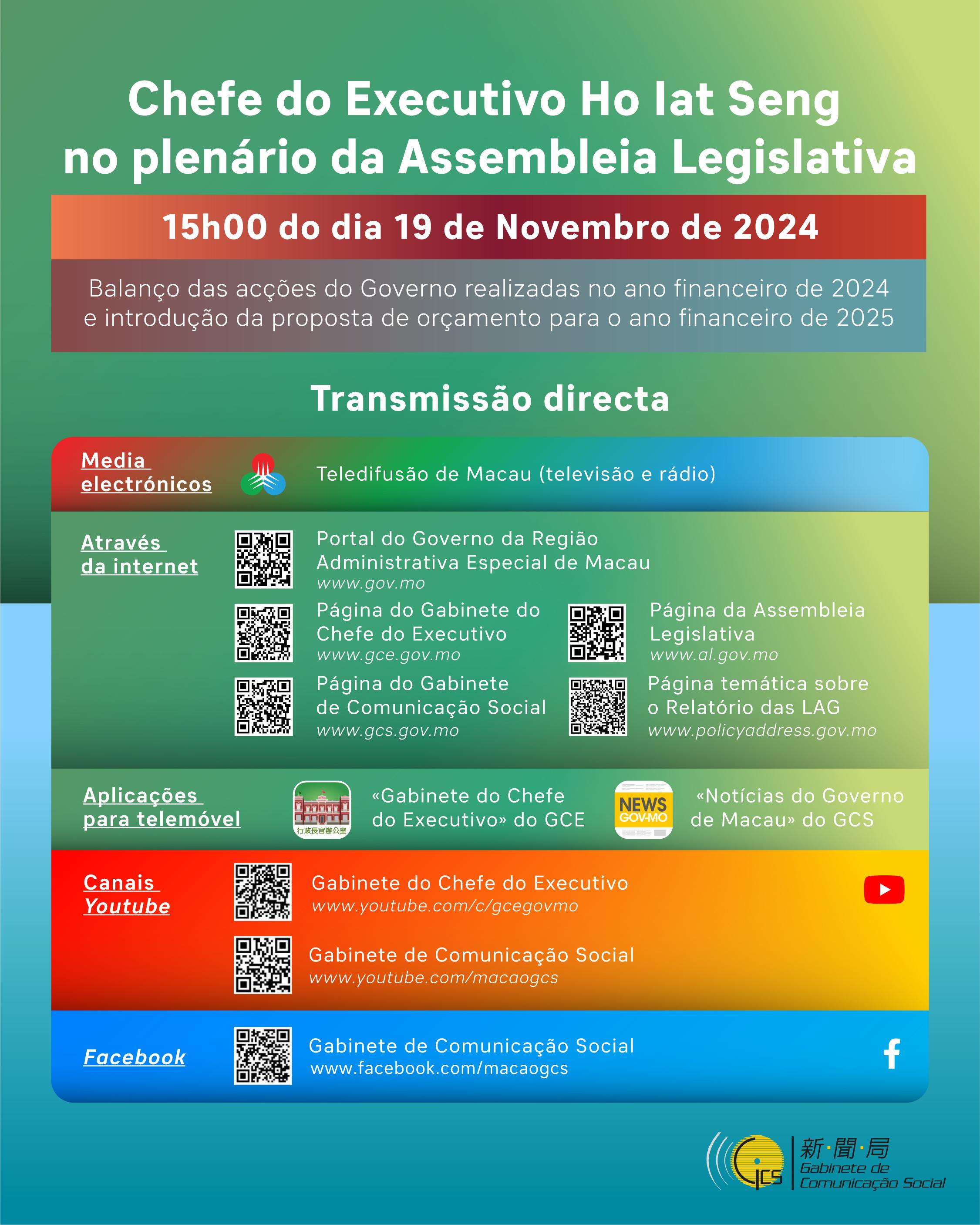O Chefe do Executivo, Ho Iat Seng, desloca-se no dia 19 de Novembro à Assembleia Legislativa, para fazer um balanço da acção governativa do corrente ano, com início marcado para as 15 horas. Na ocasião, apresentará ainda a proposta de orçamento para o ano financeiro de 2025.