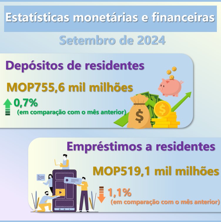 Os empréstimos internos ao sector privado decresceram 1,1% em relação ao mês anterior, tendo atingido MOP519,1 mil milhões. Da análise do crédito pelo uso económico, resulta que no terceiro trimestre de 2024, os empréstimos bancários relacionados com “transportes, armazenagem e comunicações” e “indústrias transformadoras” aumentaram 28,2% e 8,9%, respectivamente quando comparado com o trimestre anterior. Os empréstimos concedidos ao sector do “comércio por grosso e a retalho” e do “restaurantes, hotéis e similares” registaram decrescimentos de 18,5% e 5,0%, respectivamente. Por enquanto, os empréstimos ao exterior decresceram 1,4%, tendo atingido MOP527,4 mil milhões. Como resultado, os empréstimos ao sector privado decresceram 1,2% em relação ao mês anterior, tendo atingido MOP1.046,5 mil milhões, enquanto em MOP, HKD, RMB e USD, tendo “os pesos” sido alcançados 21,5%, 43,2%, 14,0% e 17,3%, respectivamente.