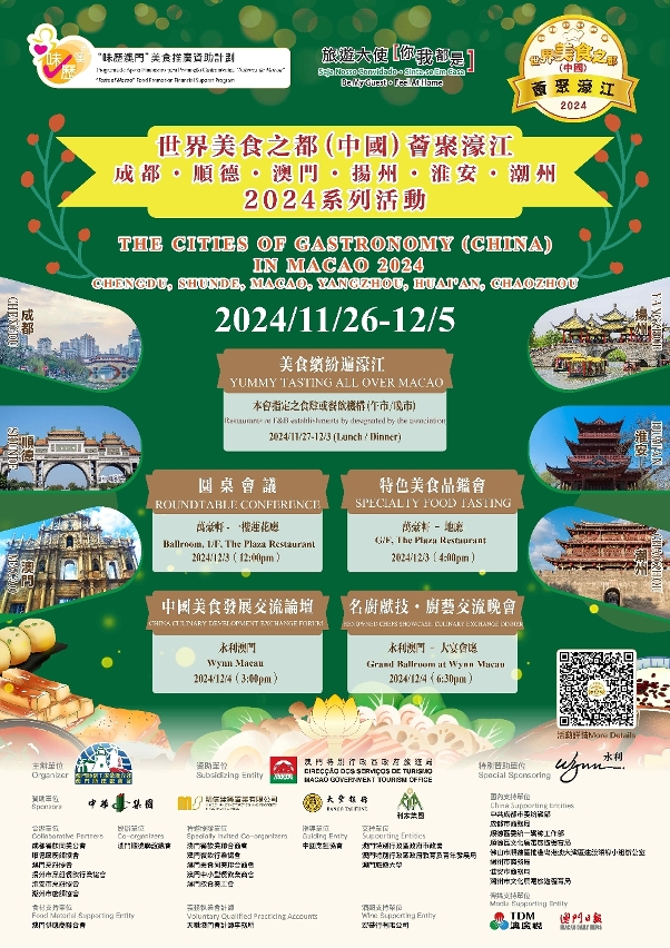 Entre 26 de Novembro e 5 de Dezembro, realiza-se a série de actividades “The Cities of Gastronomy (China) in Macao 2024”, que conta com a participação de chefs de renome e líderes do sector culinário de Chengdu, Shunde, Yangzhou, Huai’an, Chaozhou e Macau, para promover o intercâmbio cultural entre as Cidades Criativas de Gastronomia. Através de ofertas culinárias, fórum de gastronomia e sessões de degustação de especialidades, entre outras actividades, os visitantes podem sentir o “sabor único” de Macau enquanto Cidade Criativa de Gastronomia.