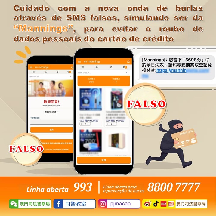 Recentamente, a Polícia Judiciária descobriu mensagens SMS de phishing que simulavam ter sido enviadas aleatoriamente pela “Mannings”, para os cidadãos de Macau. As mensagens alegavam que o prazo de validade dos bónus da sua conta estava prestes a expirar, induzindo as pessoas a clicar num link indicado nessa mensagem, para trocar pontos por produtos a preços baixos. Assim, os burlões roubavam informações dos cartões de crédito para realizar transacções de elevado valor não autorizadas.